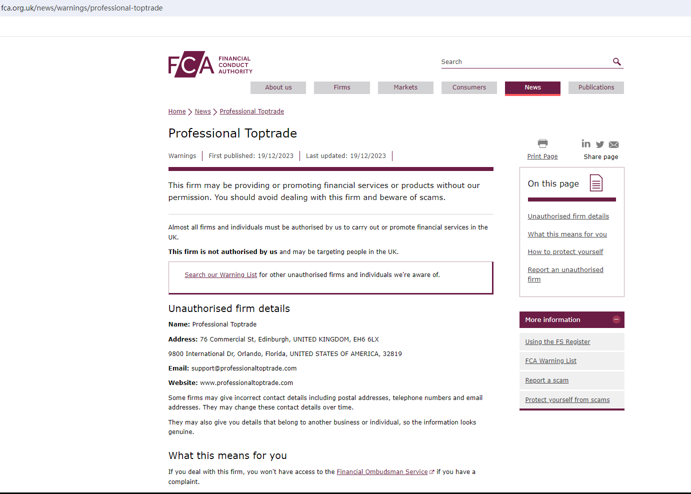 On 19 December 2023, the United Kingdom Financial Conduct Authority (UK FCA) issued a warning that Professional Toptrade was providing financial services or products in the UK without authorisation. You may visit: https://www.fca.org.uk/news/warnings/professional-toptrade