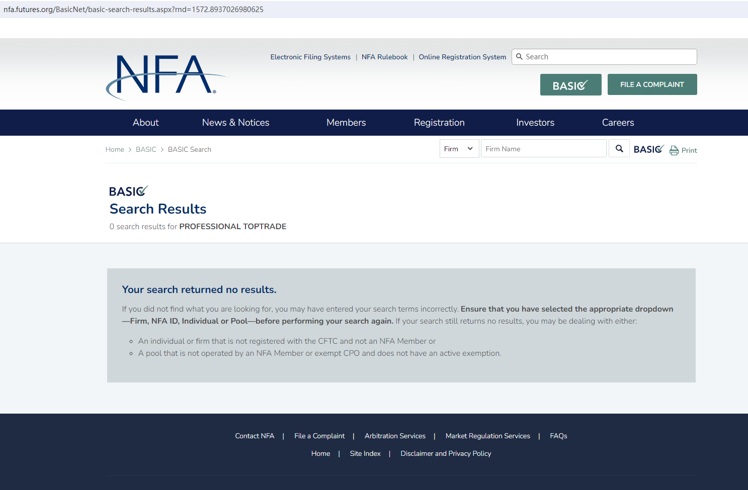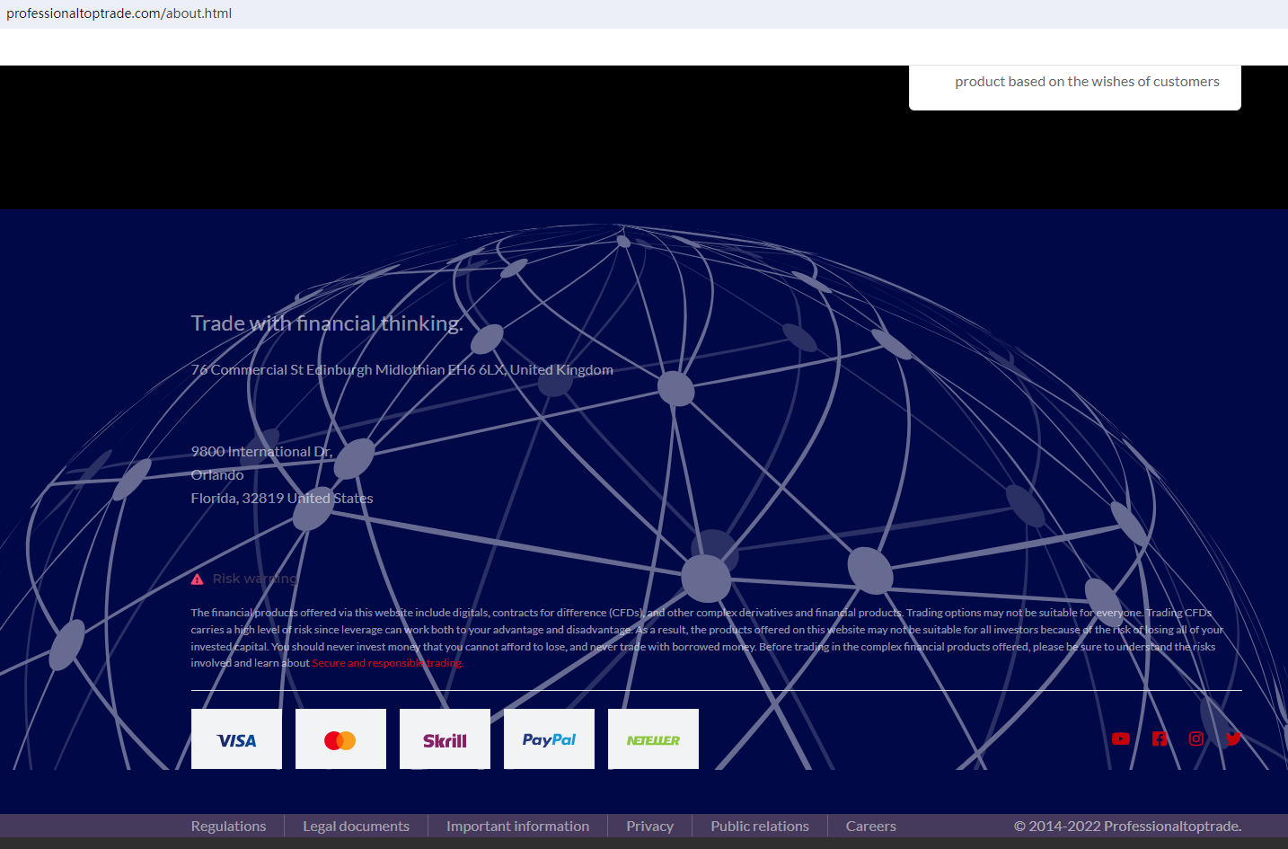 It claims to have two office addresses. One is in the UK and the other is in the USA. Upon investigation, no matching information was found in the National Futures Association (NFA). In addition, the United Kingdom Financial Conduct Authority (UK FCA) issued a warning that Professional Toptrade was providing financial services or products in the UK without authorisation.