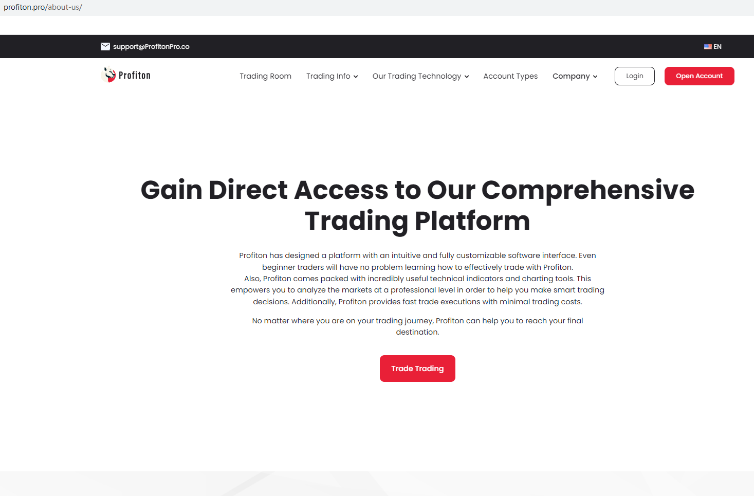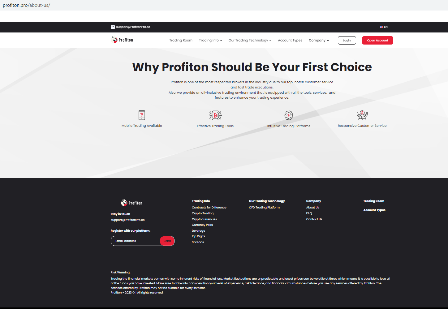 Profiton claims to be a reliable company without presenting any information about its regulation or contact. The lack of such important information may be a distinct signal of an unlicensed broker, as regulated companies always present their accreditations and licenses in a prominent position. It is a red flag.