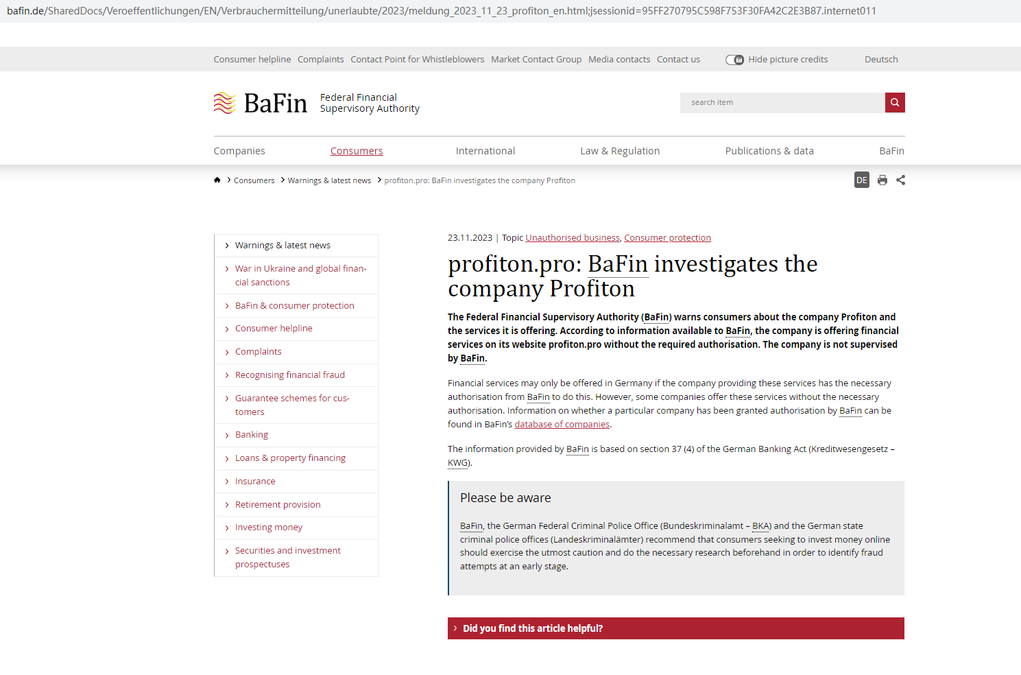 In addition, the Federal Financial Supervisory Authority (Bafin) issued a warning against Profiton, the operator is providing financial and investment services on this website without the required authorisation.