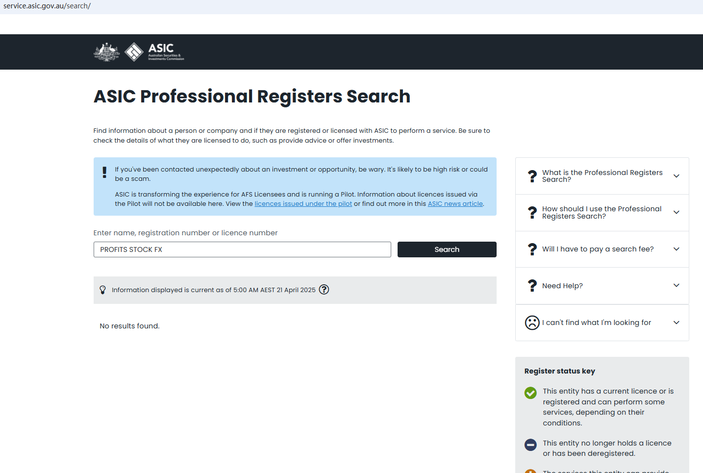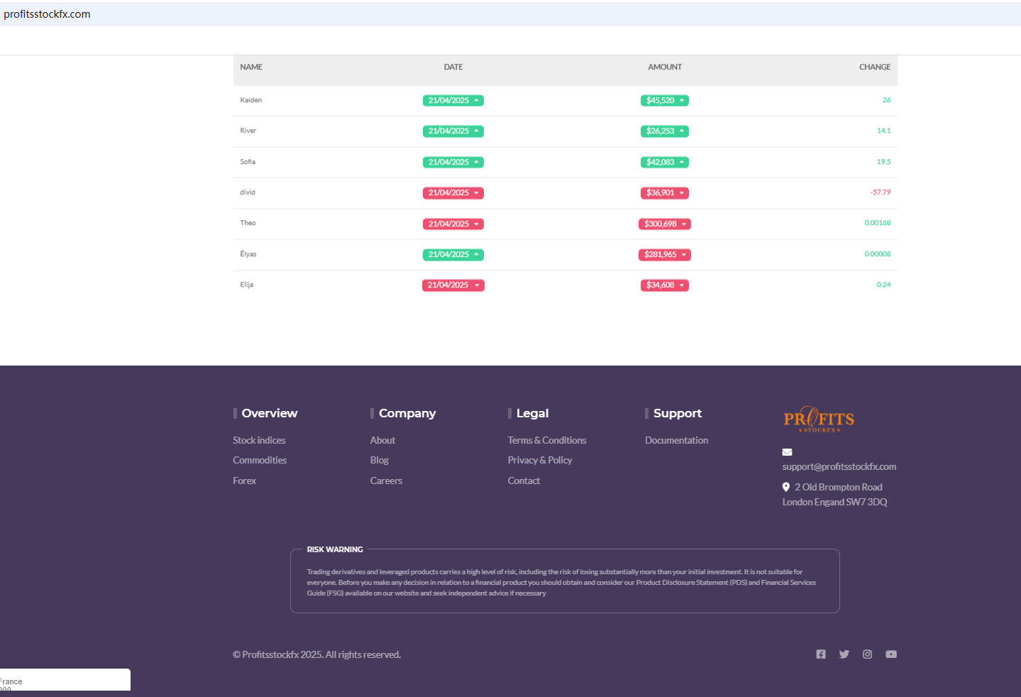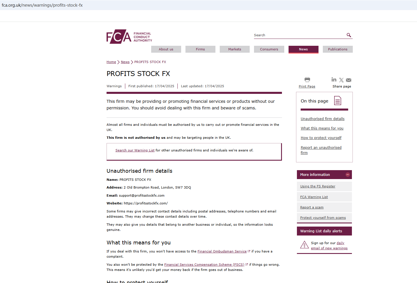 On April 17, 2025, the Financial Conduct Authority (FCA) issued a warning against PROFITS STOCK FX, believing this company might be providing financial services or products without proper authorization in the UK. https://www.fca.org.uk/news/warnings/profits-stock-fx