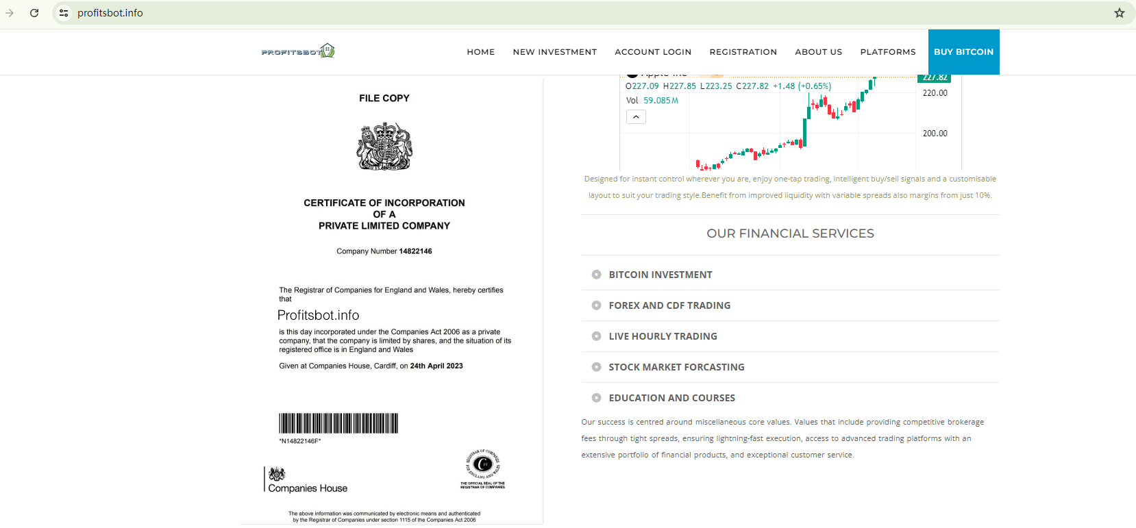 PROFITSBOT operates on a website template that is commonly linked to fraudulent schemes. The broker presents a certificate, allegedly from Companies House (CH), to seem legitimate. However, it is crucial to understand that registration with CH does not equate to authorization for conducting financial transactions. Furthermore, our investigation indicates that the purported certificate is counterfeit.