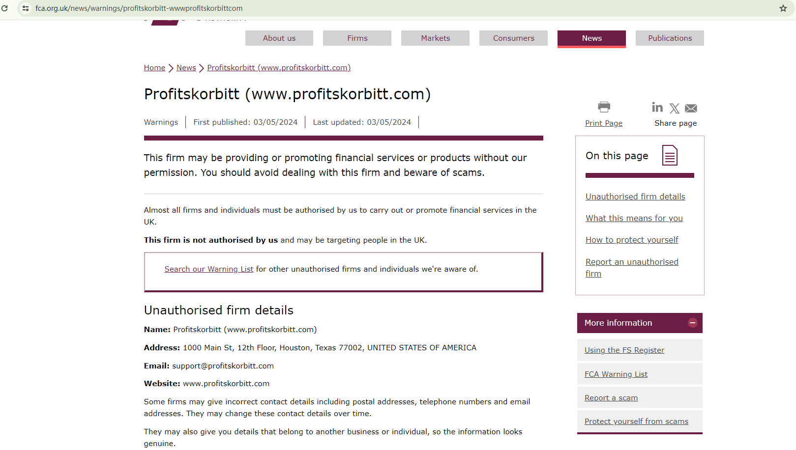 Profitskorbitt purports to be authorized and regulated by the Financial Conduct Authority (FCA). However, this claim has been refuted by the FCA itself, which has issued a warning against this potentially fraudulent trading platform. The UK's financial watchdog categorizes Profitskorbitt as an unauthorized firm operating within its jurisdiction.