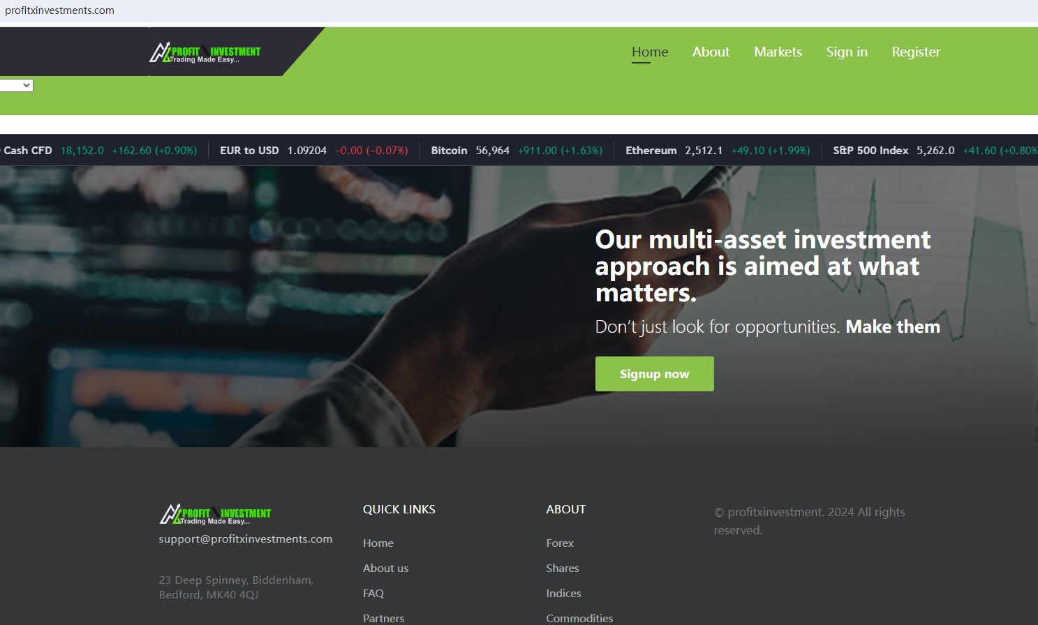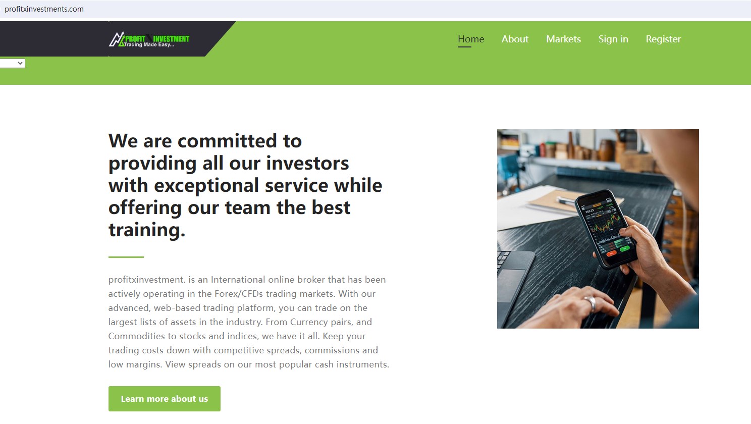 Profitxinvestment claims to be an International online broker located in the UK, offering wide range of financial services, including Forex, Shares, Indices,Commodities and more instruments in global markets. But it lacks crucial regulatory information. A company that offers financial services must have financial license in the country where it is located.