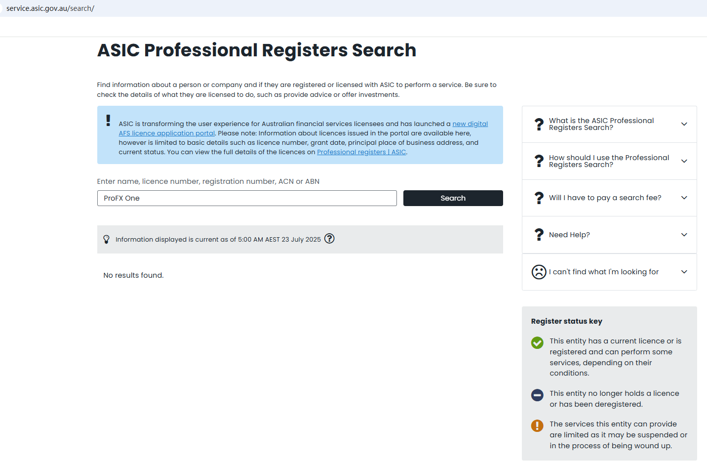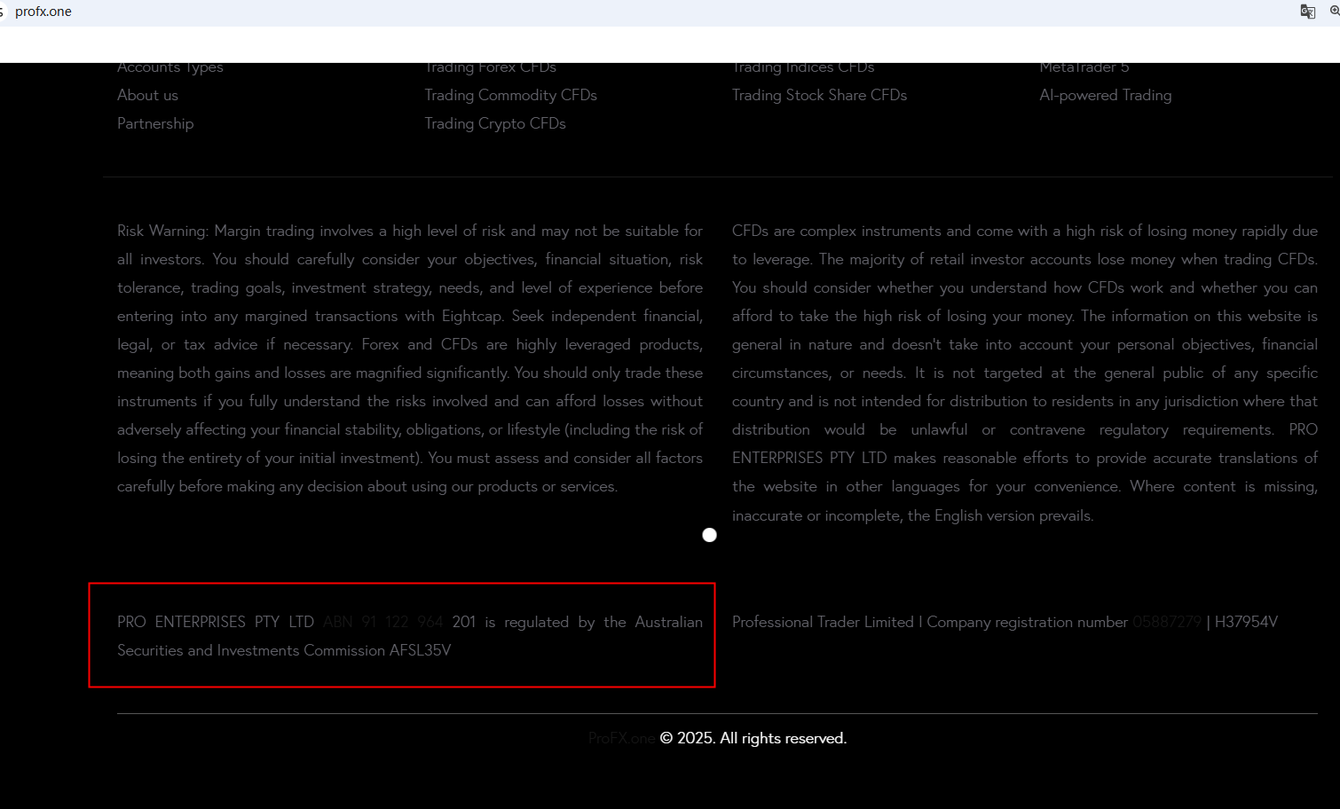 According to its website, it claims to be regulated by Australia Securities & Investment Commission (ASIC), but upon investigation, no matching information was found in ASIC. In addition, the Financial Conduct Authority (FCA) issued a warning against ProFX One, believing this company might be providing financial services or products without proper authorization in the UK.