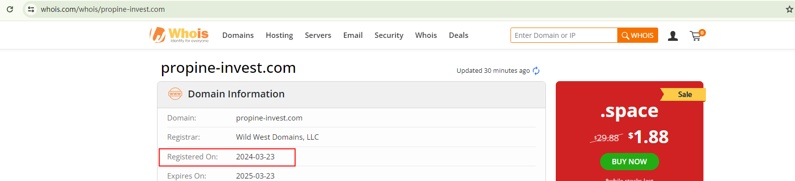 The GSE, or Government-Sponsored Enterprise, is a quasi-governmental entity and not a financial regulator in the USA. Despite its assertions of a long-standing business history, the domain name for Propine Invest was only registered recently, in late March 2024. This discrepancy between the claimed years of operation and the recent establishment of the website is a common red flag.