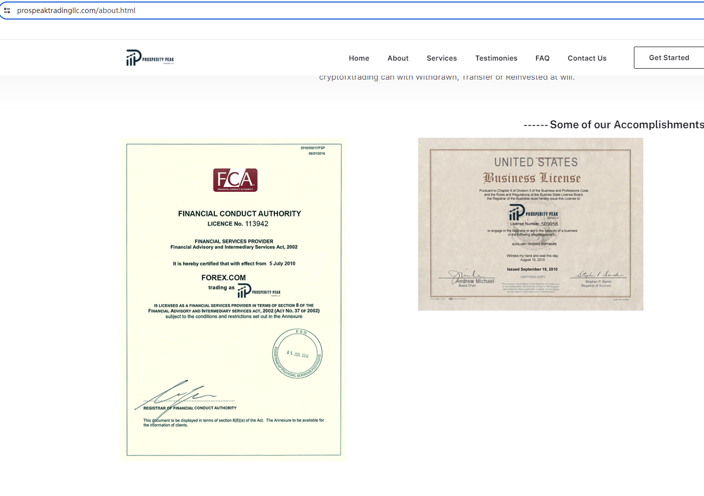According to its website, it displays Financial Conduct Authority (FCA) and National Futures Assocaition (NFA) certificates on its website. Upon investigation, we found that the name we saw on NFA does not match the brand and is not a member of NFA. In addition, we found that the website and name registered with the FCA were inconsistent with Prosperity Peak Trading LLC, and it was obvious that the brand had stolen the regulatory information of a compliant broker.