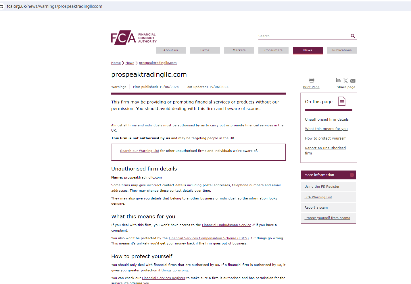 On June 19, 2024, the Financial Conduct Authority (FCA) issued a warning against Prosperity Peak Trading LLC, believing this company might be providing financial services or products without proper authorization in the UK. https://www.fca.org.uk/news/warnings/prospeaktradingllccom