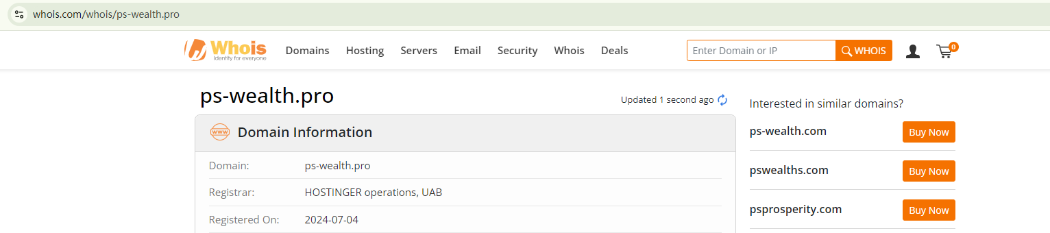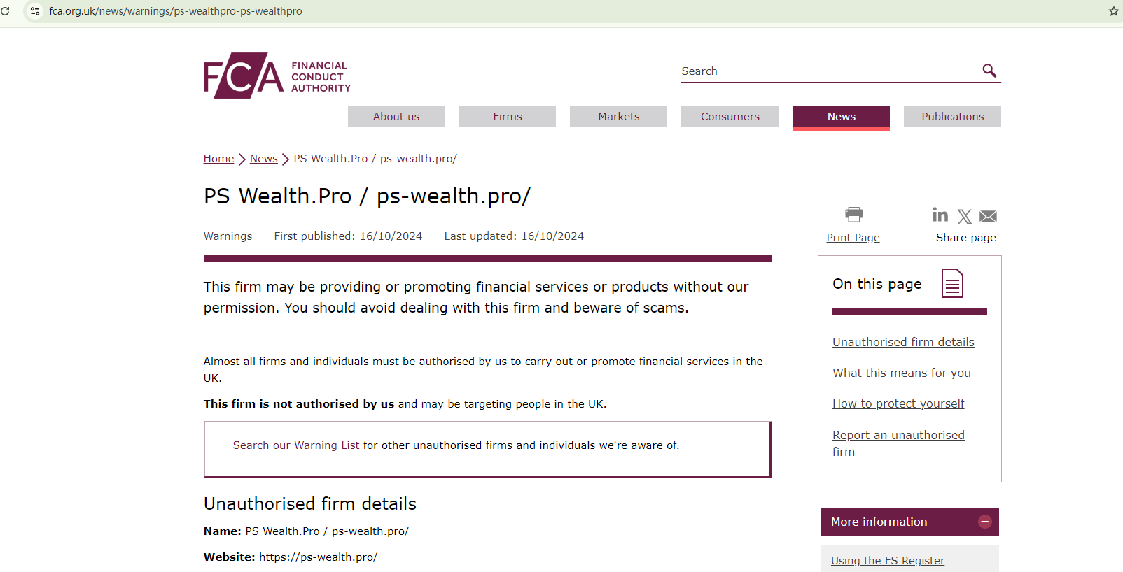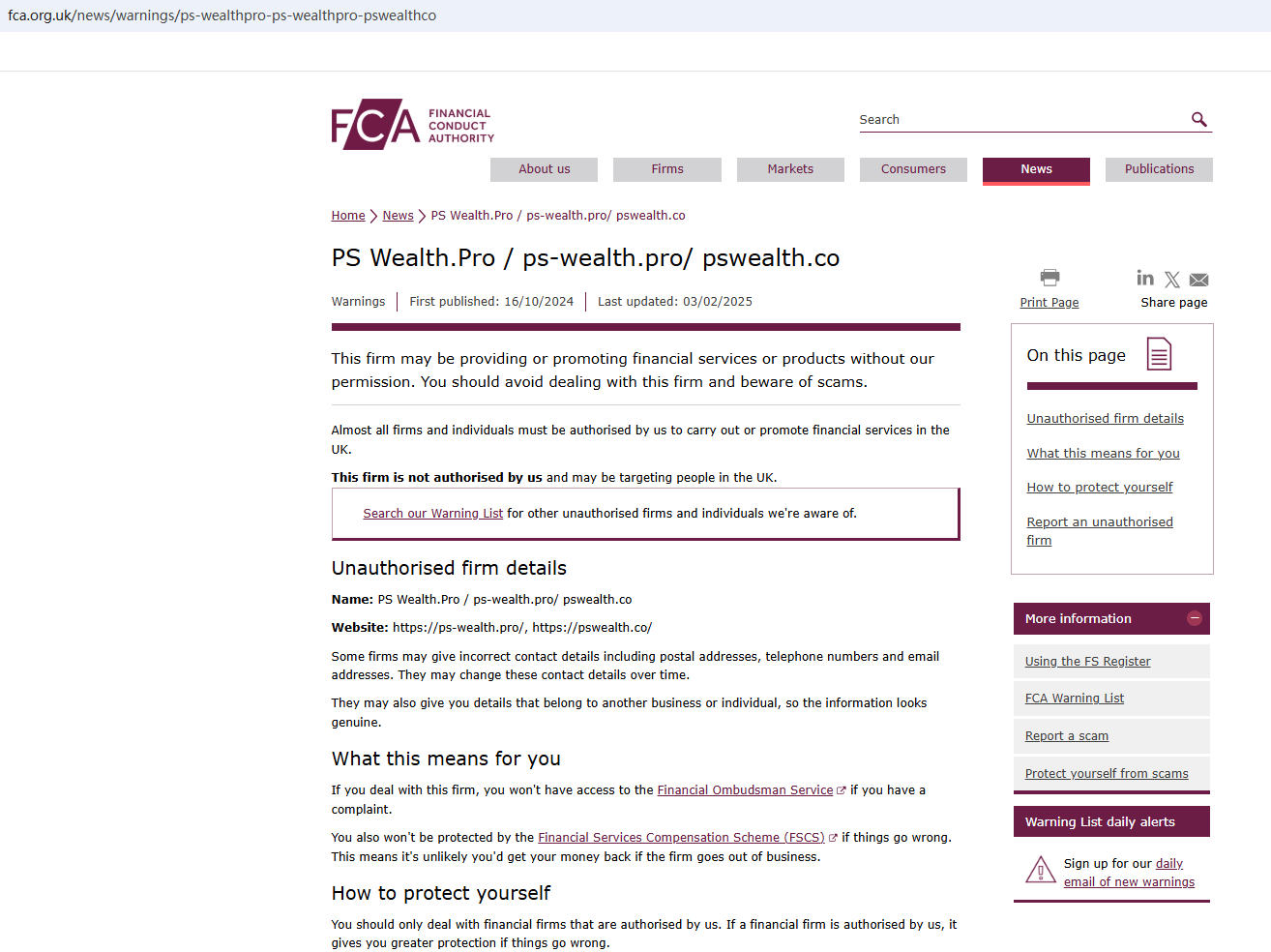 On October 16, 2024, the Financial Conduct Authority (FCA) issued a warning about PS Wealth.Pro, flagging it as an unauthorized firm in the UK. https://www.fca.org.uk/news/warnings/ps-wealthpro-ps-wealthpro