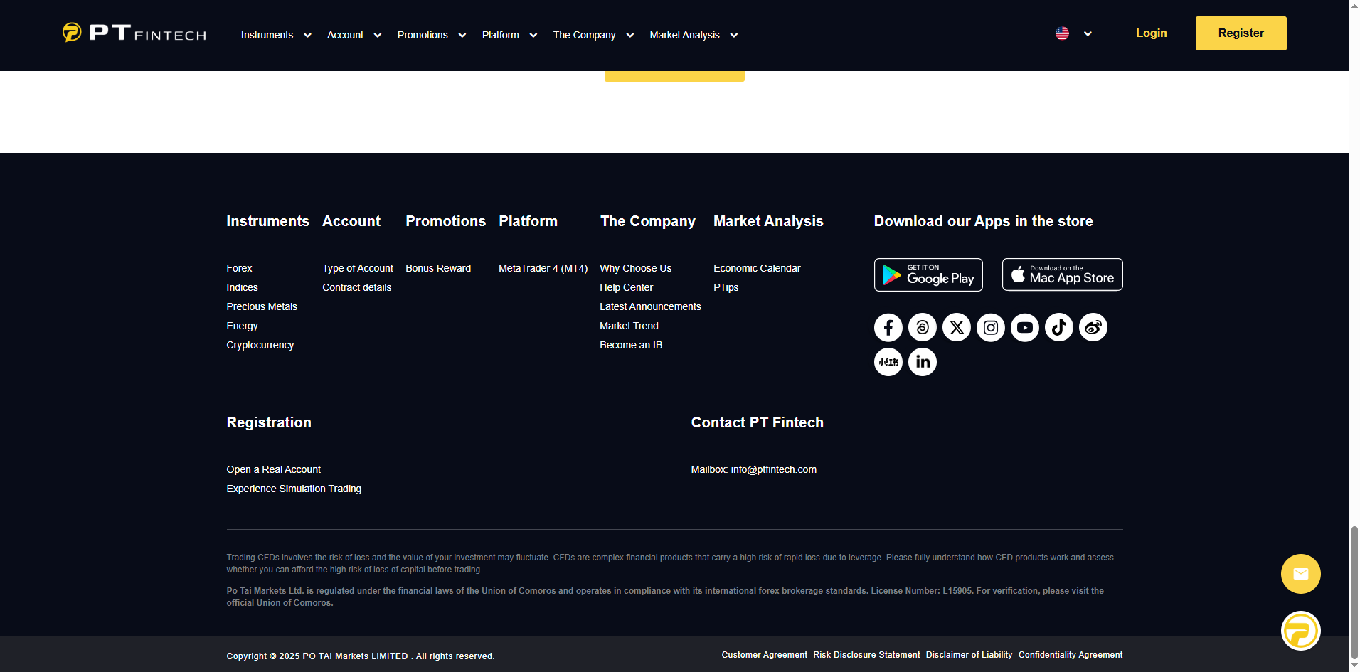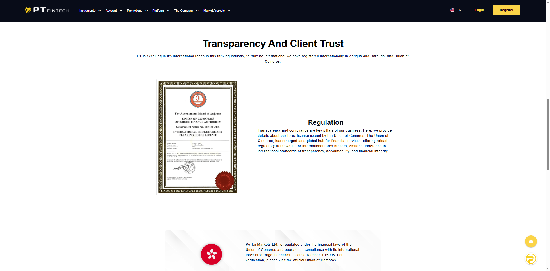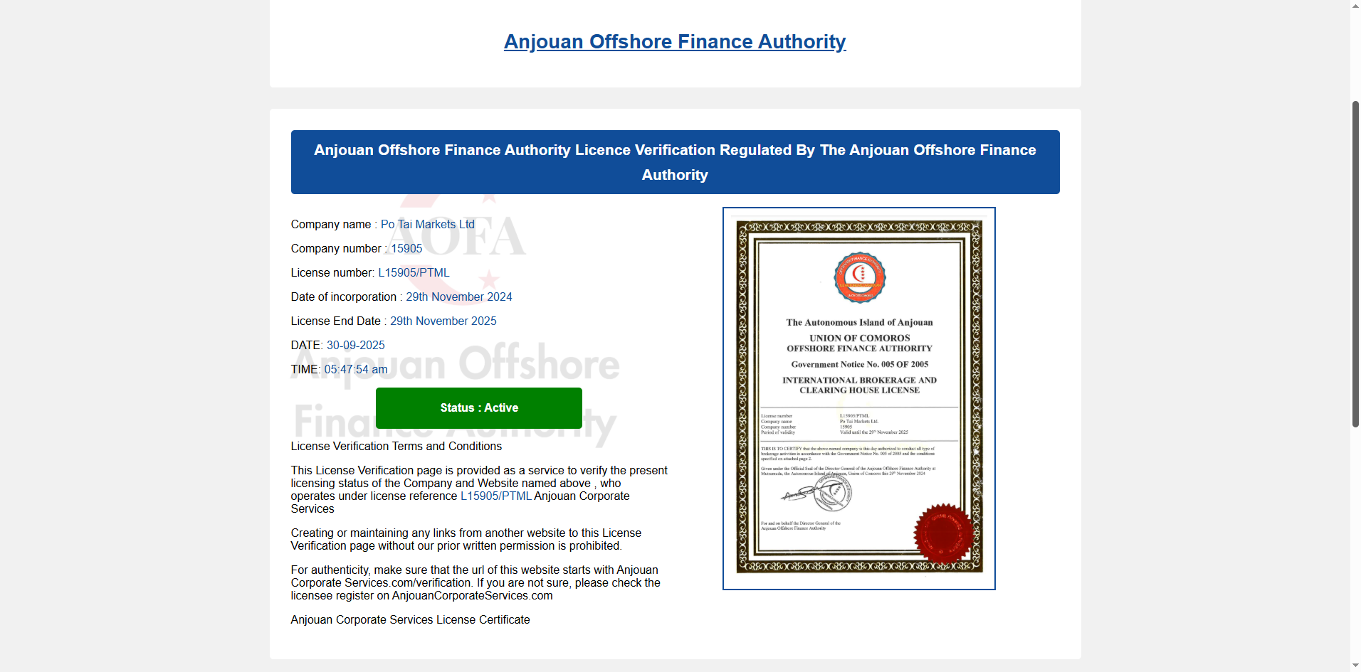 PT Fintech claims to be regulated through Po Tai Markets Ltd., which reportedly holds a license issued by the Anjouan Offshore Finance Authority (AOFA) in Comoros. However, AOFA is an offshore regulatory body known for its weak oversight and lack of international recognition. Its regulatory framework is generally considered unreliable by global financial standards.
