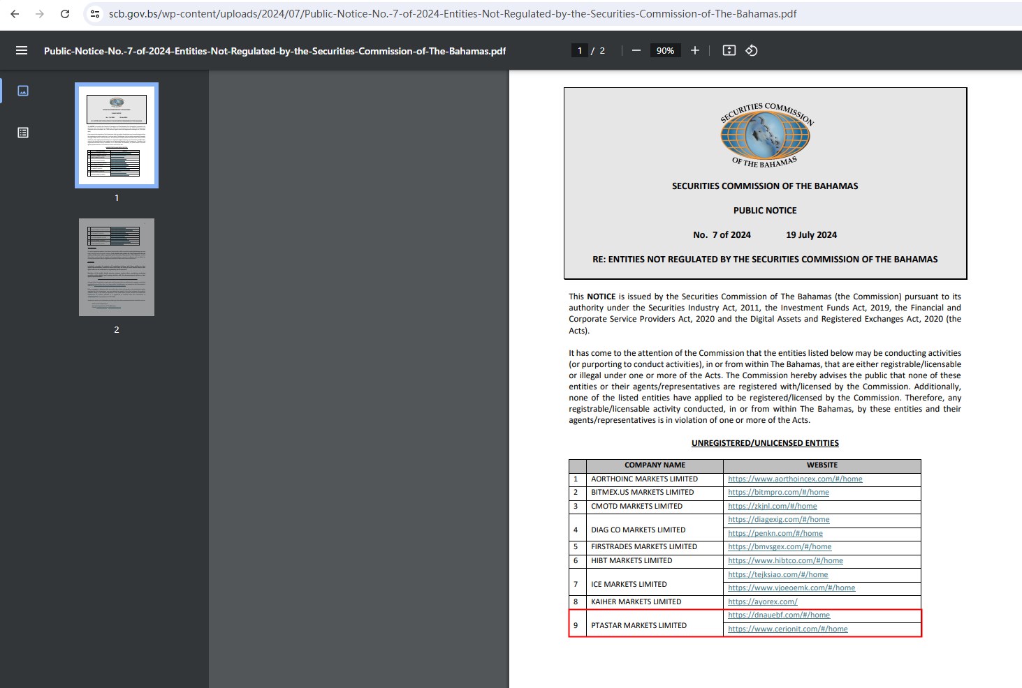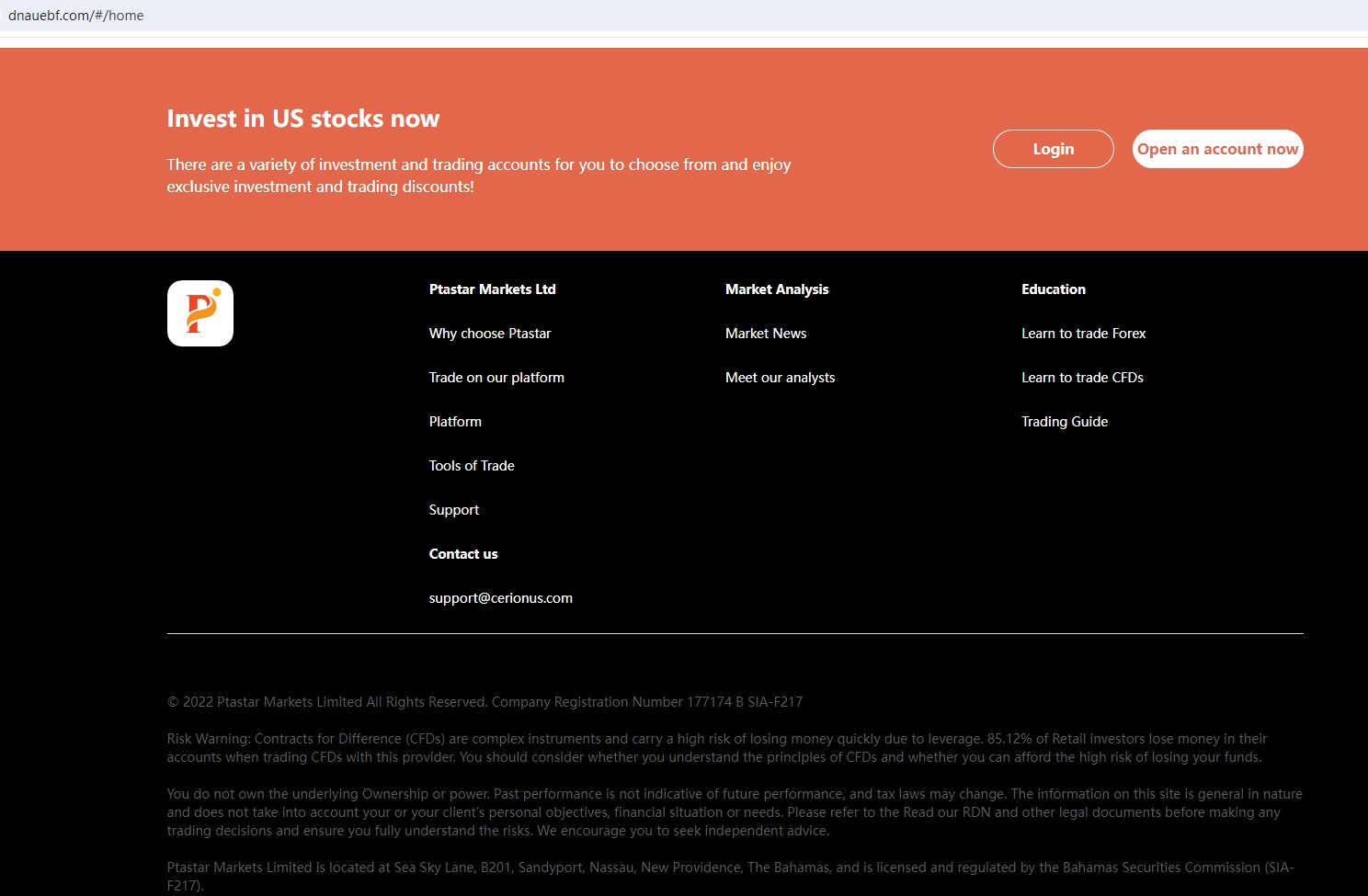 On 19 July 2024, the Securities Commission of The Bahamas (SCB) issued a warning against PTASTAR MARKETS LIMITED (dnauebf.com & cerionit.com), believing this company might be providing financial services or products without authorisation. You may visit: https://www.scb.gov.bs/wp-content/uploads/2024/07/Public-Notice-No.-7-of-2024-Entities-Not-Regulated-by-the-Securities-Commission-of-The-Bahamas.pdf.