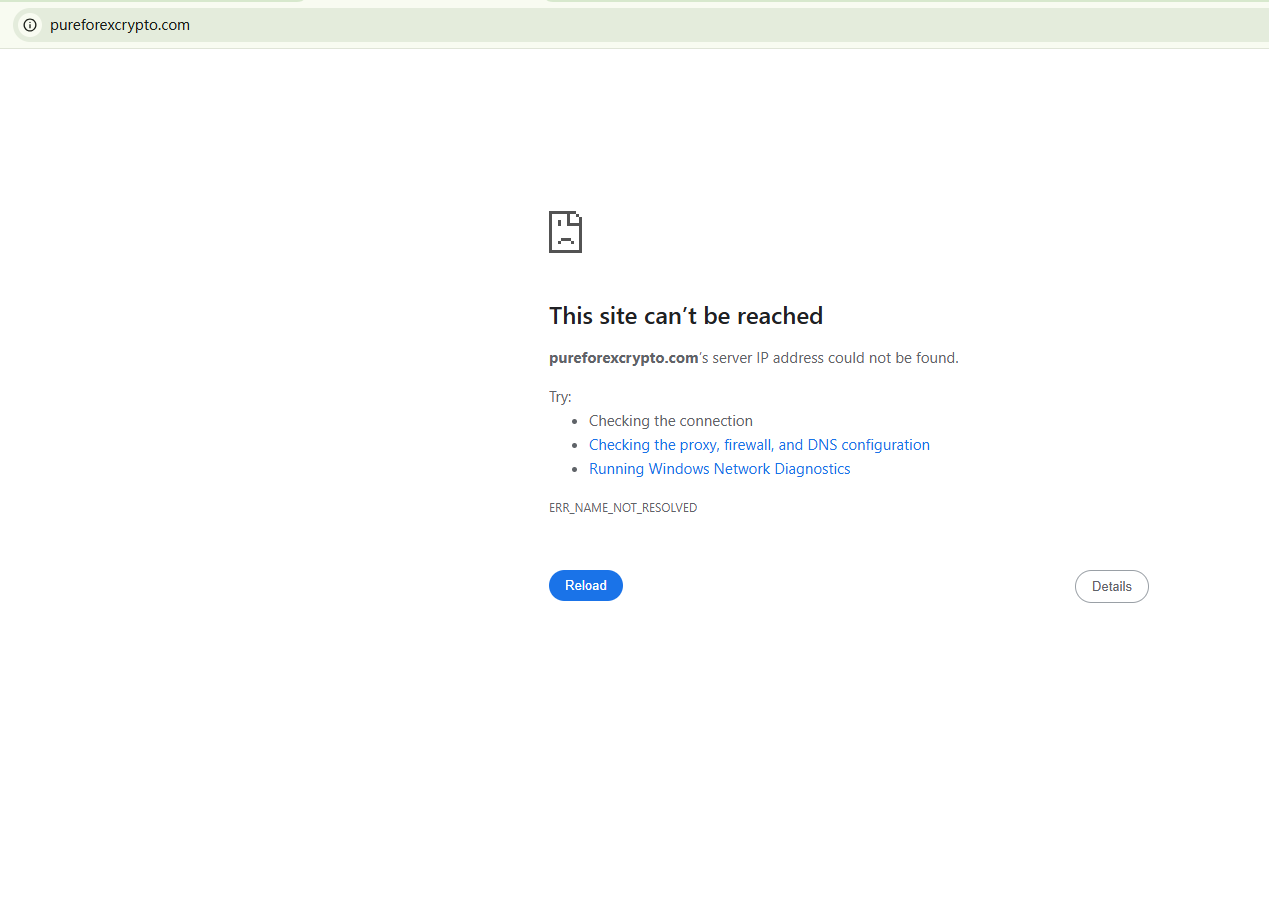BrokersView found that the domain "https://pureforexcrypto.com/" is currently inaccessible. This is widely regarded as a significant red flag, as the suspension of a broker's website often points to underlying regulatory or operational issues.