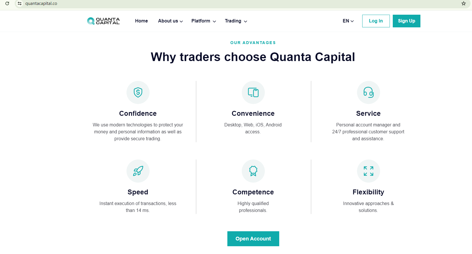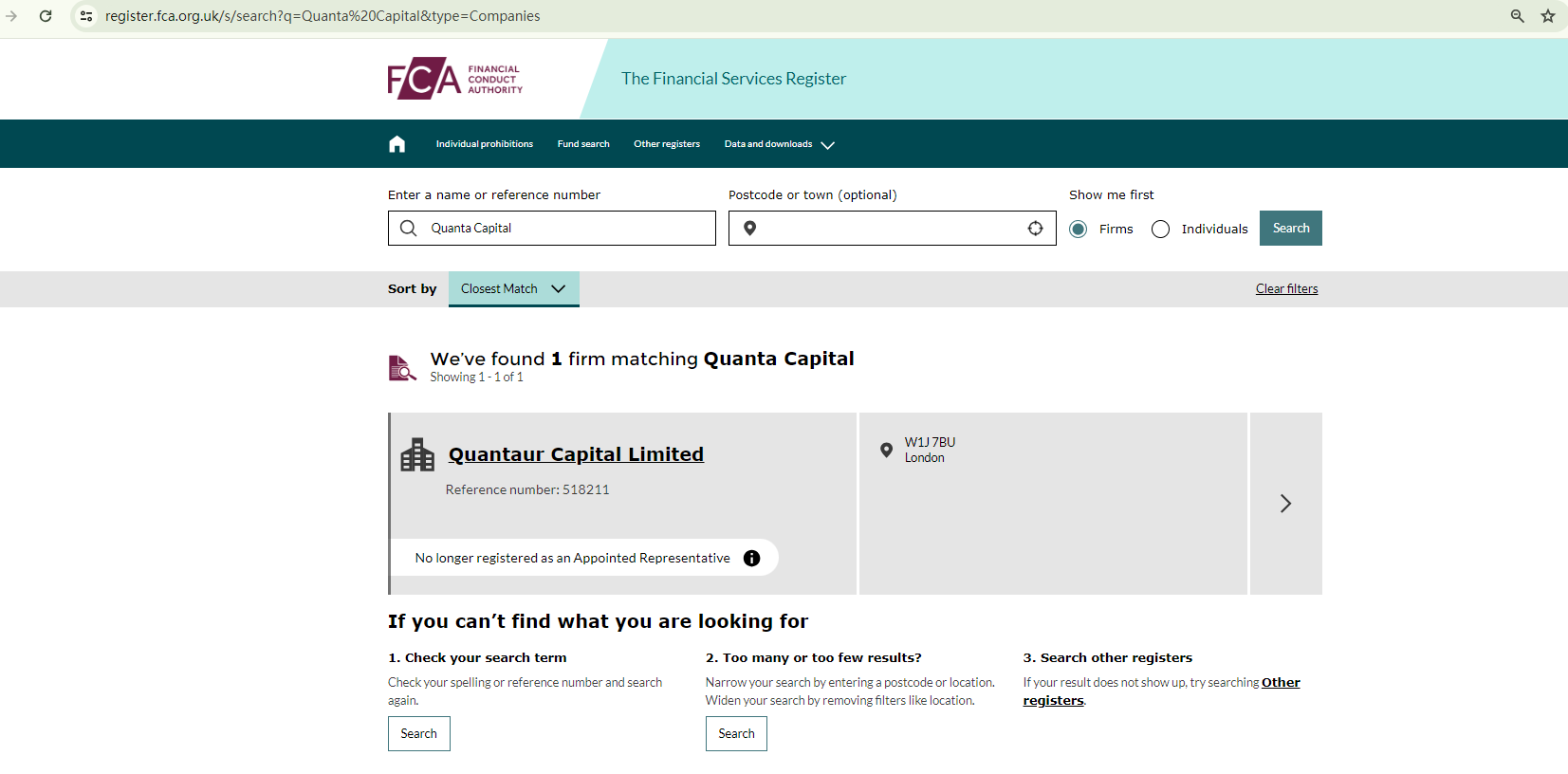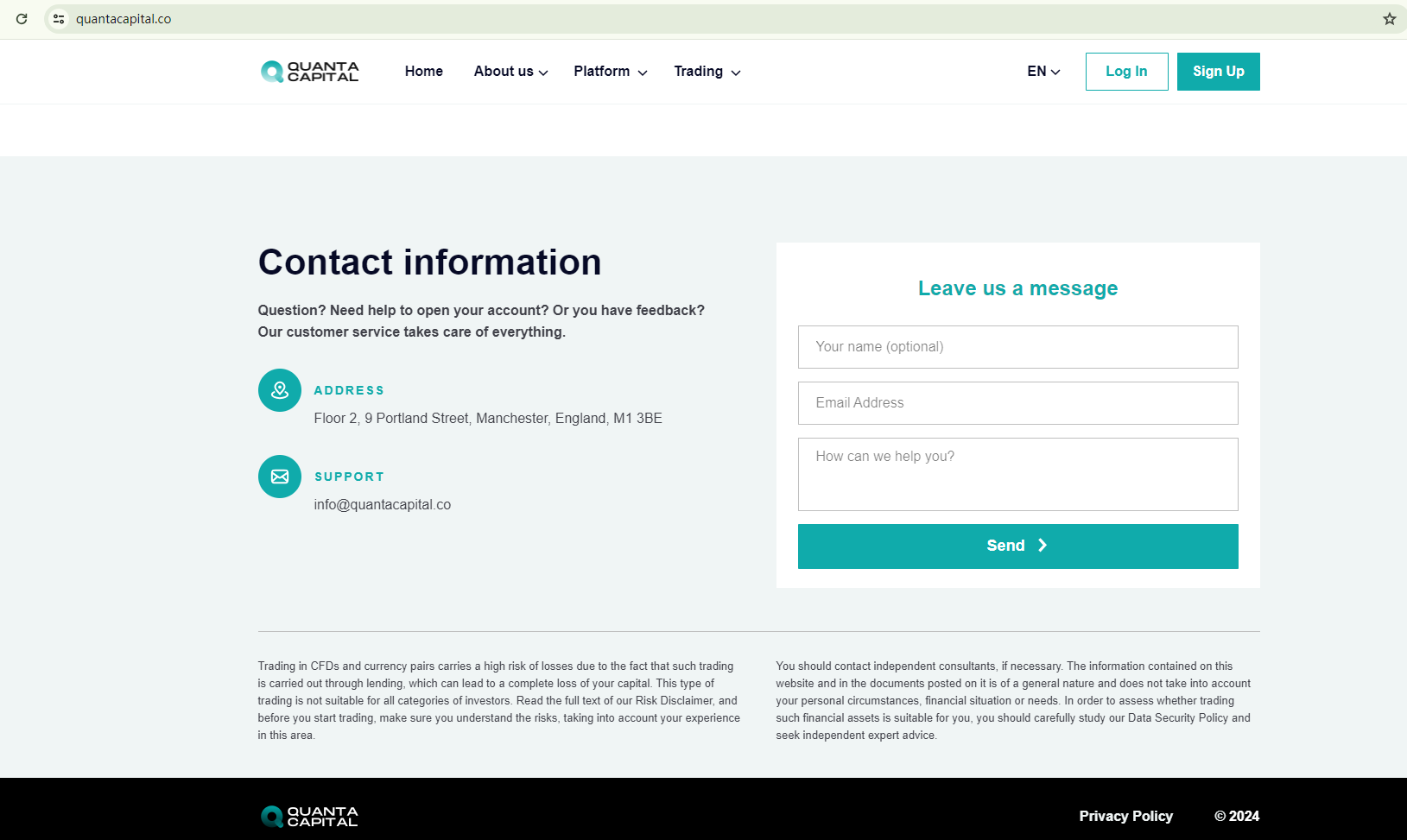 While Quanta Capital claims to be located in the UK, there are no indications that it is registered with the Financial Conduct Authority (FCA). This is a red flag.