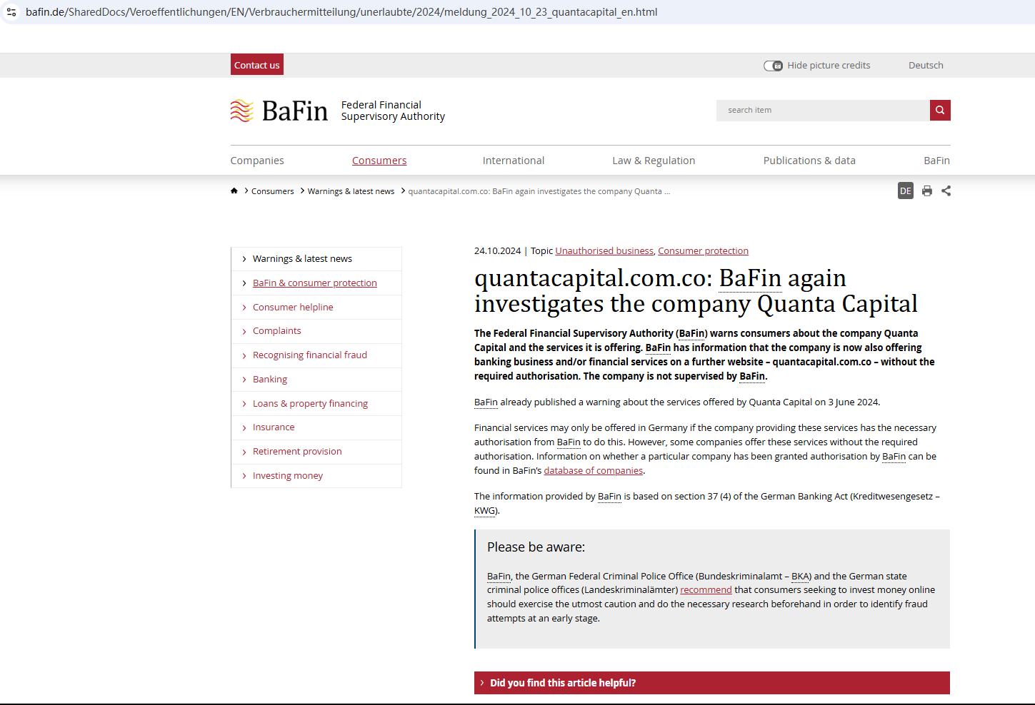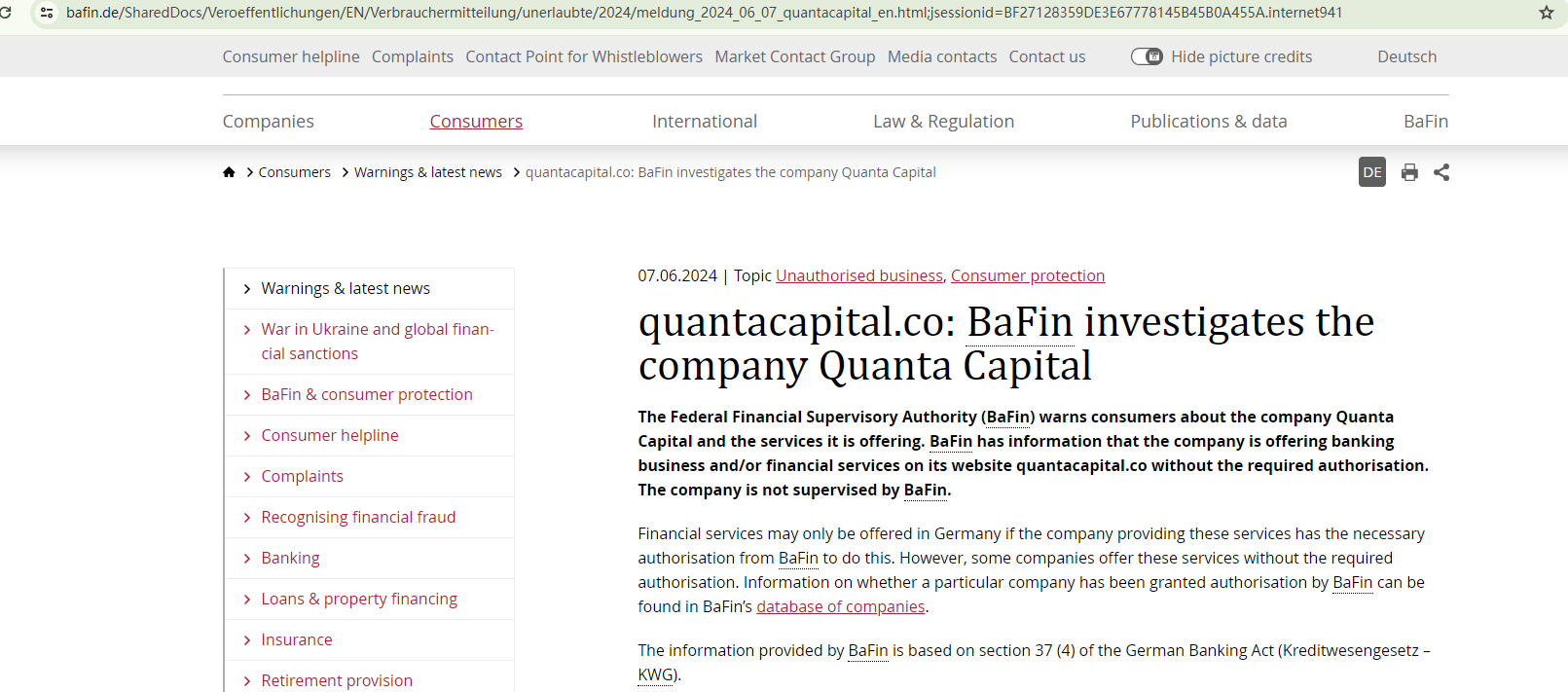 What's more, the Federal Financial Supervisory Authority (BaFin) has issued a warning against Quanta Capital, stating that it is offering financial services without the required authorization and is not subject to BaFin.