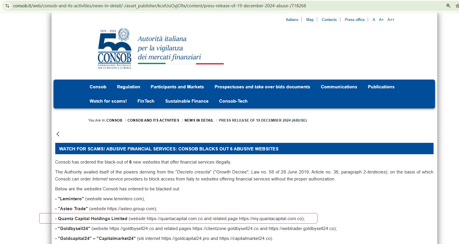 On December 19, 2024, the Italian Companies and Exchange Commission (CONSOB) ordered Quanta Capital to be blacked out since it offers financial services illegally in Italy. https://www.consob.it/web/consob-and-its-activities/news-in-detail/-/asset_publisher/kcxlUuOyjO9x/content/press-release-of-19-december-2024-abuse-/718268
