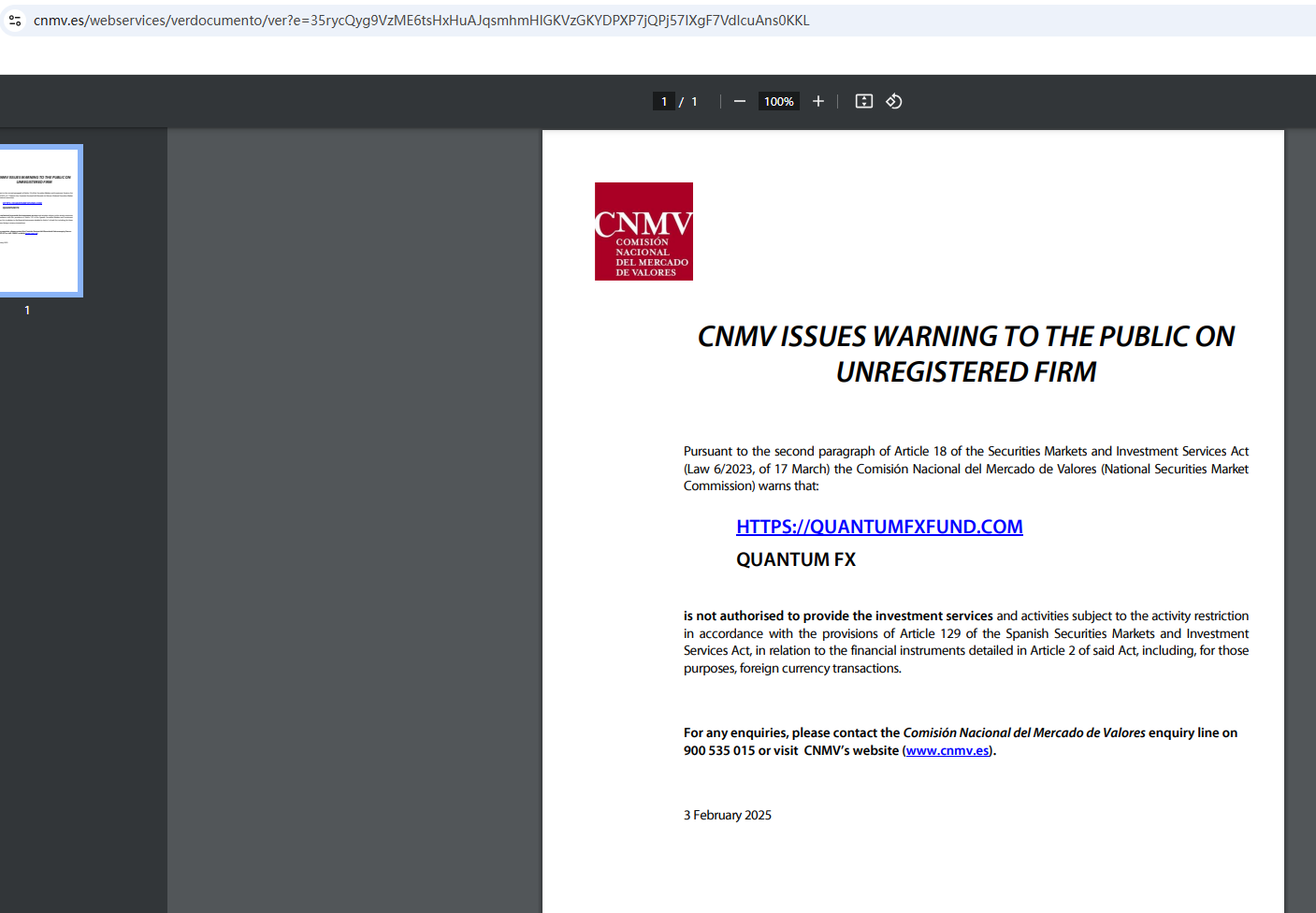 On February 3, 2025, the National Securities Market Commission (CNMV) warned consumers about the services offered by the company Quantum FX, which is offering financial and investment services without the required authorization. https://www.cnmv.es/webservices/verdocumento/ver?e=35rycQyg9VzME6tsHxHuAJqsmhmHlGKVzGKYDPXP7jQPj57IXgF7VdIcuAns0KKL