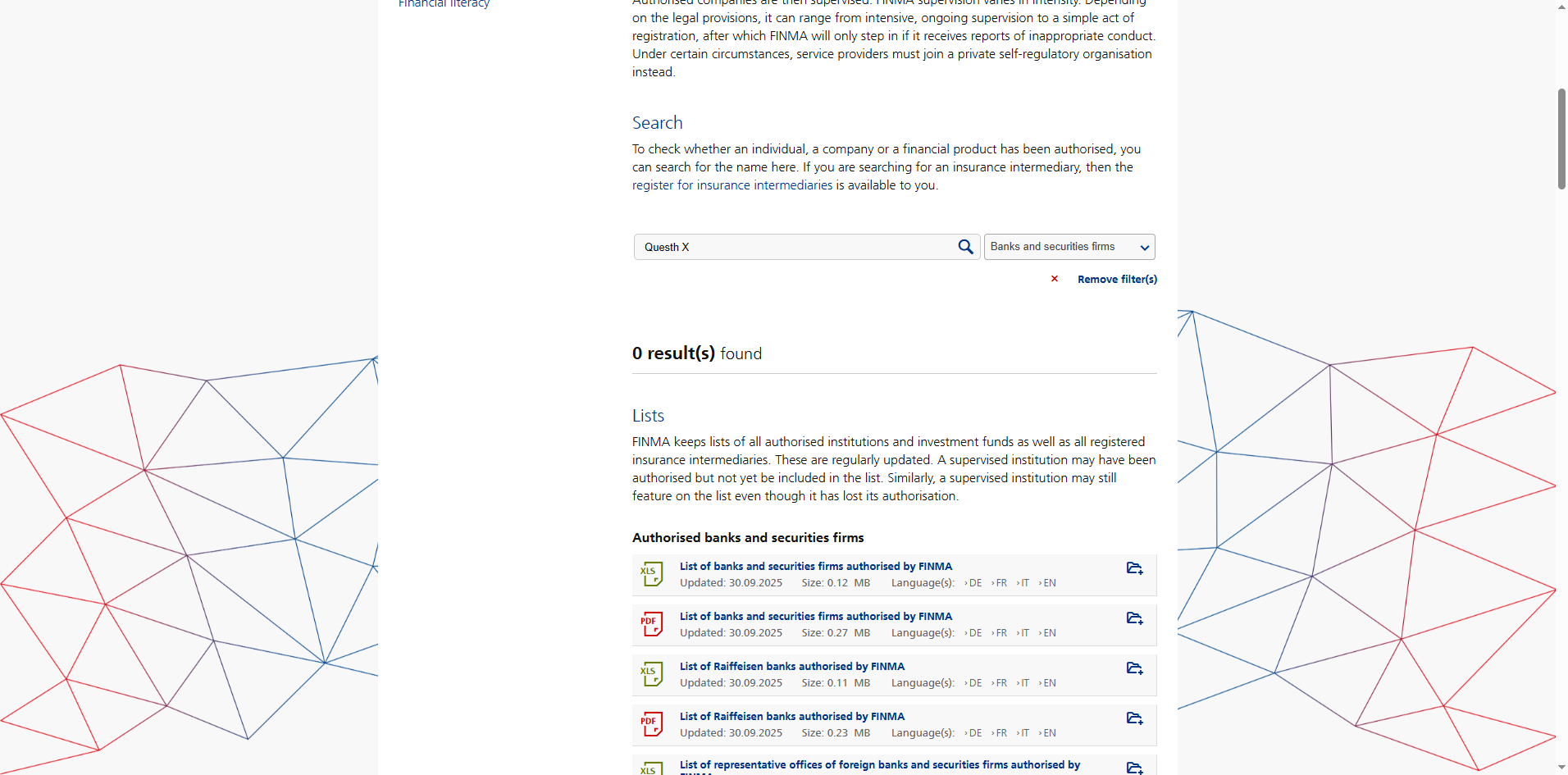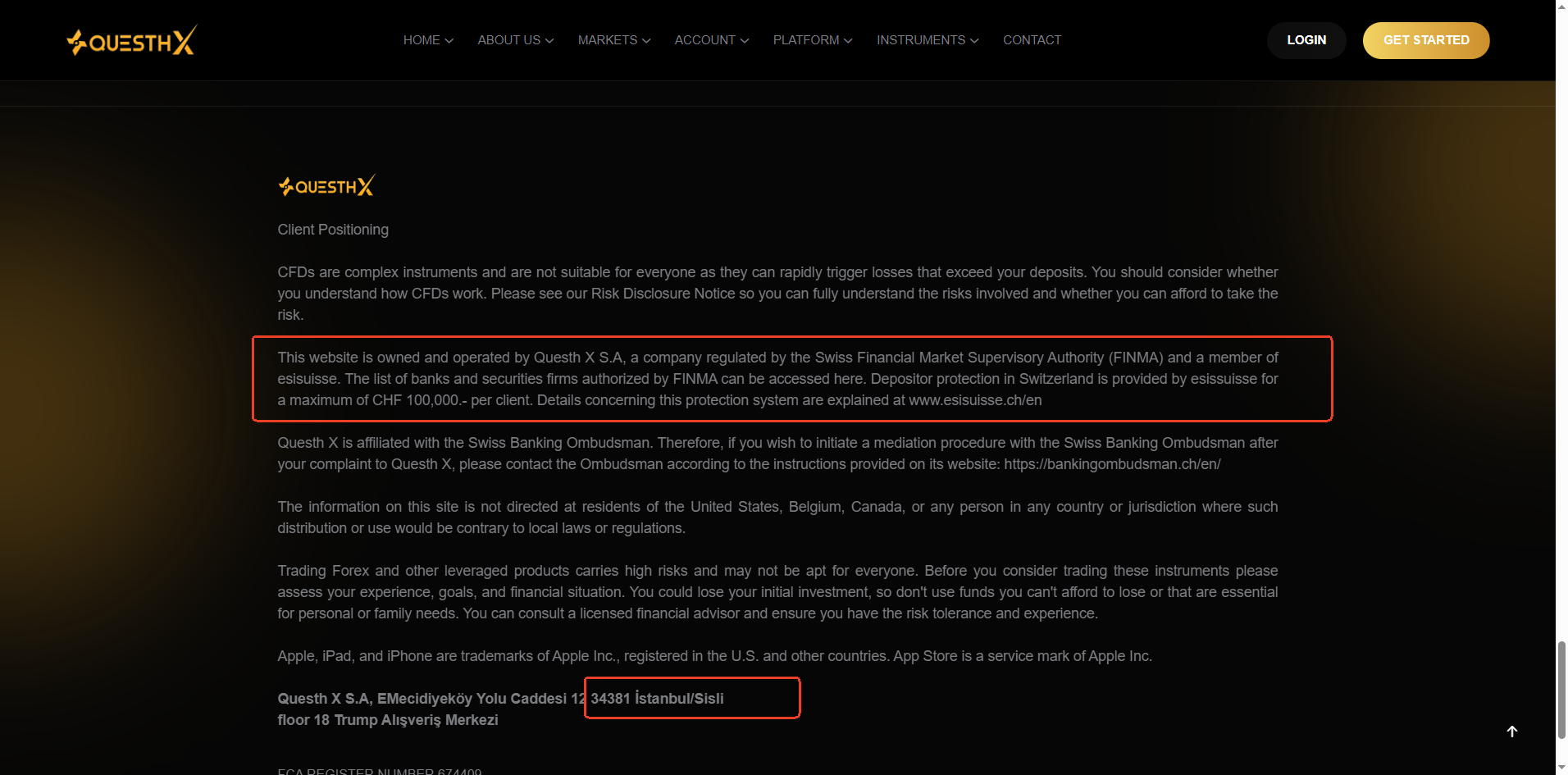 Questh X claims to be operated by Questh X S.A. and states that it is regulated and authorized by the Swiss Financial Market Supervisory Authority (FINMA). However, upon checking FINMA’s official list of authorized financial institutions, we found no record of Questh X S.A. This false claim of Swiss regulation is highly suspicious and constitutes a major red flag.