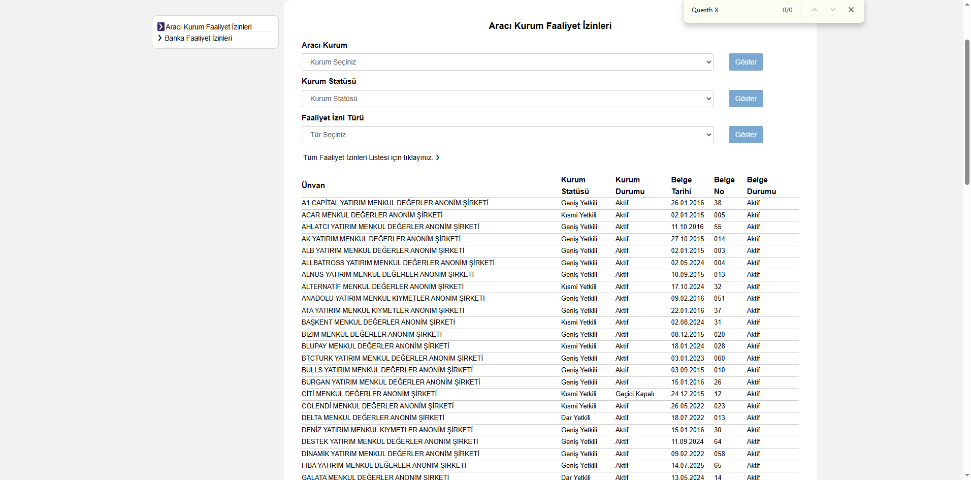 Furthermore, Questh X indicates that its company address is in Turkey. To verify this, we searched the registry of licensed entities maintained by the Turkish Capital Markets Board (CMB). Again, no associated entity was found under this jurisdiction.