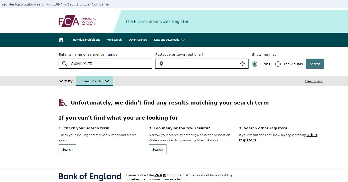 Upon investigation, we found that QUINNIX LTD is not regulated by the United Kingdom Financial Conduct Authority (FCA).