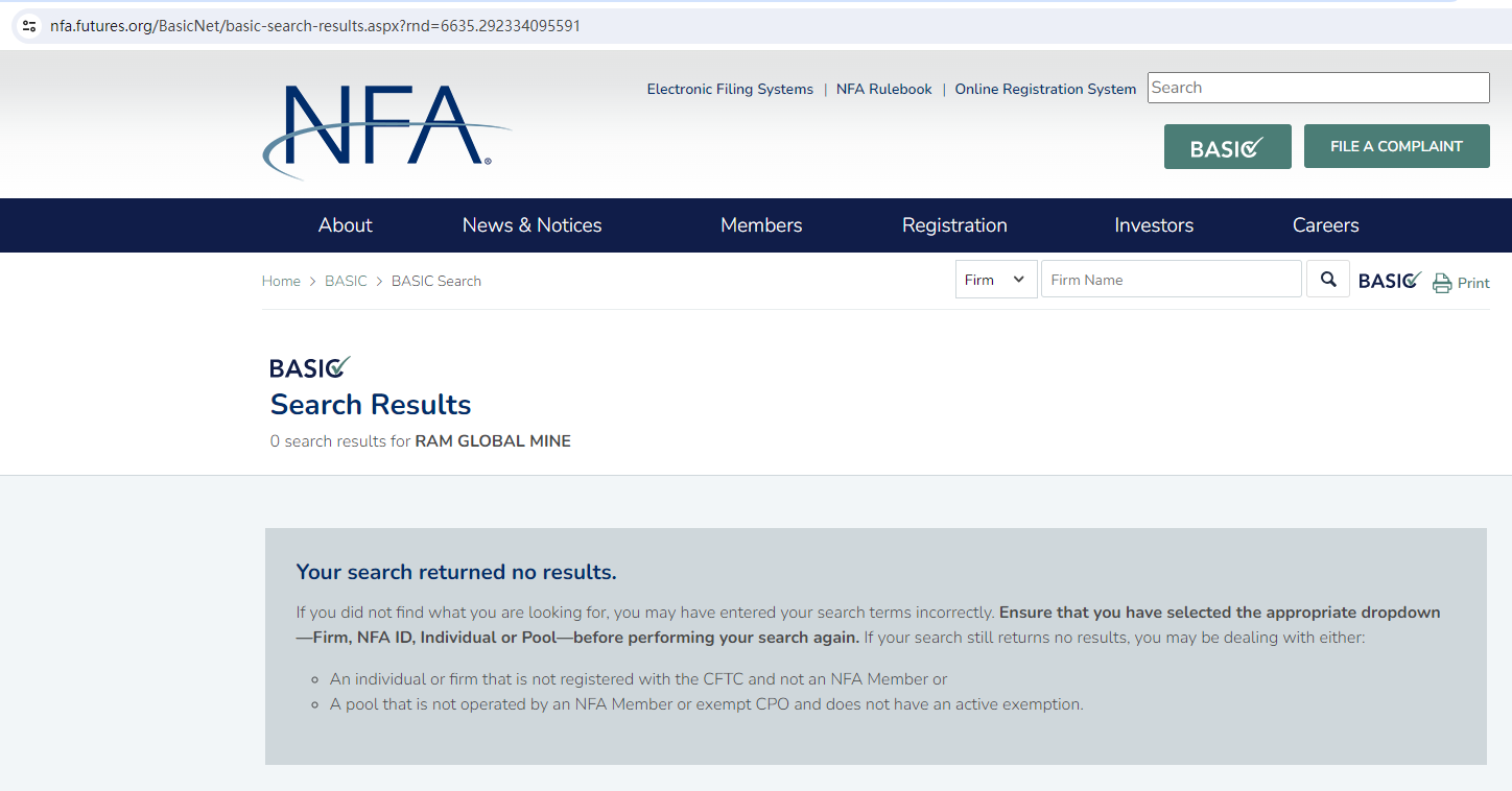 The truth is that Ram Global Mine is not regulated by any regulators. Letting it hold or control investors' money is unsafe, and the money can not be protected by any laws.