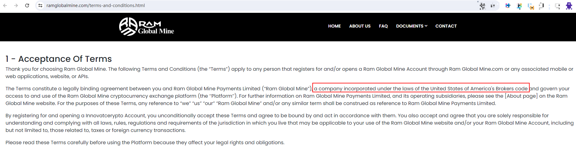Ram Global Mine claims to be operated by Ram Global Mine Payments Limited, a company incorporated under the laws of the United States of America's Brokers code.