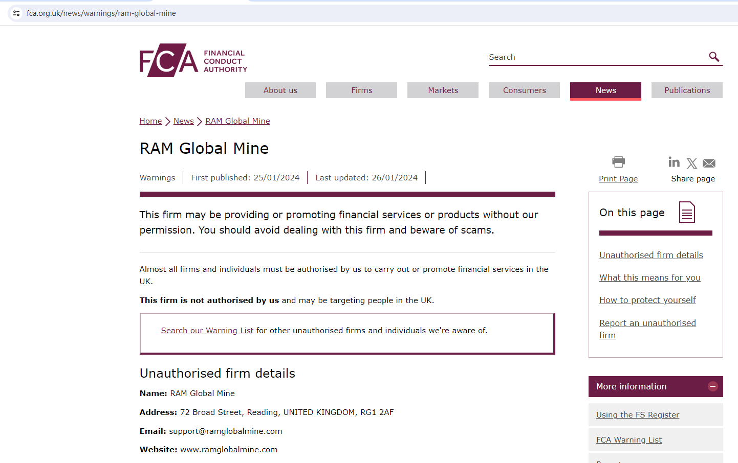 On January 26, 2024, the Financial Conduct Authority (FCA) issued a warning against Ram Global Mine, believing this company might be providing financial services or products without proper authorization in the UK. https://www.fca.org.uk/news/warnings/ram-global-mine