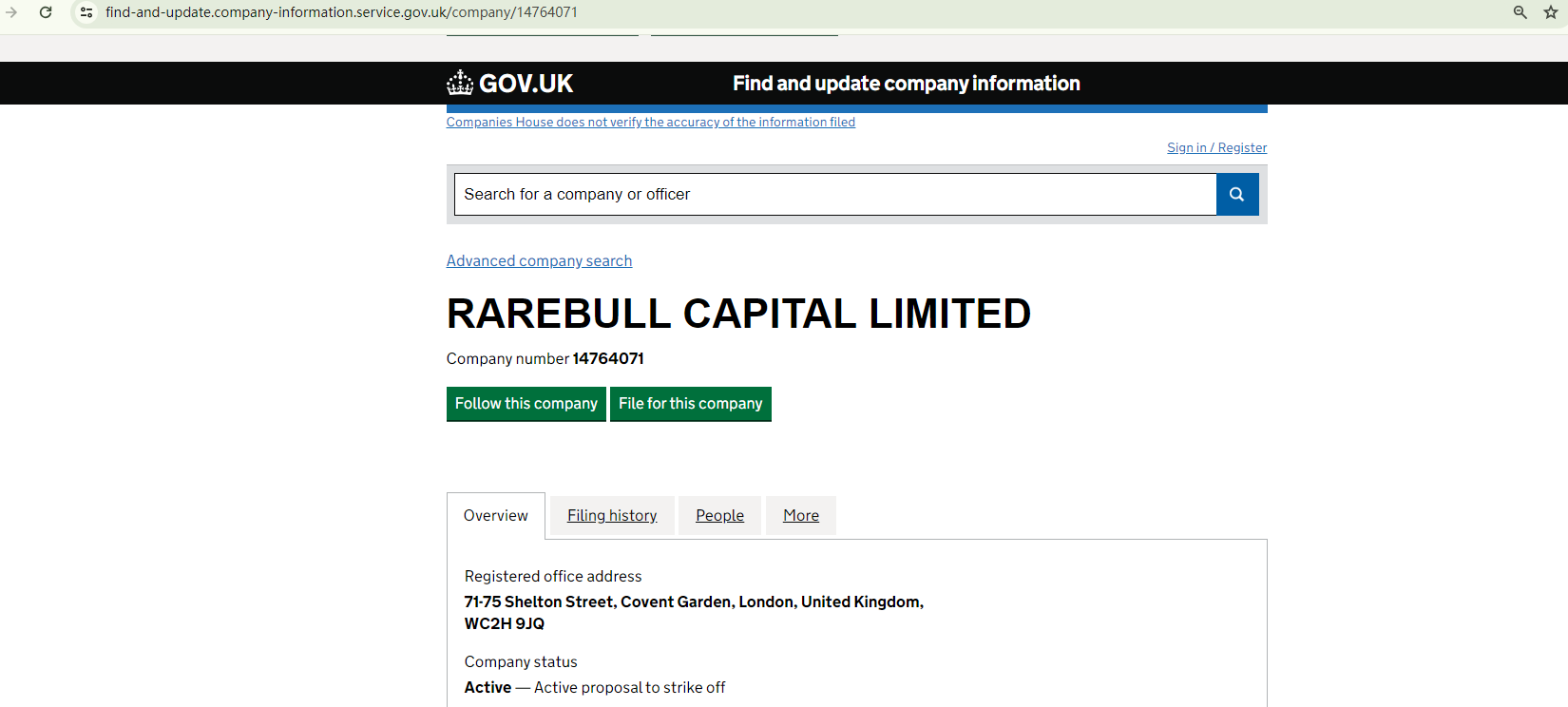 However, the records from the CH indicate that the company is "active to strike off", which raises suspicion. Regarding its claims of being authorized by the FCA, the FCA has issued a warning against it, refuting these claims. Similarly, there are no corresponding records in the ASIC register.