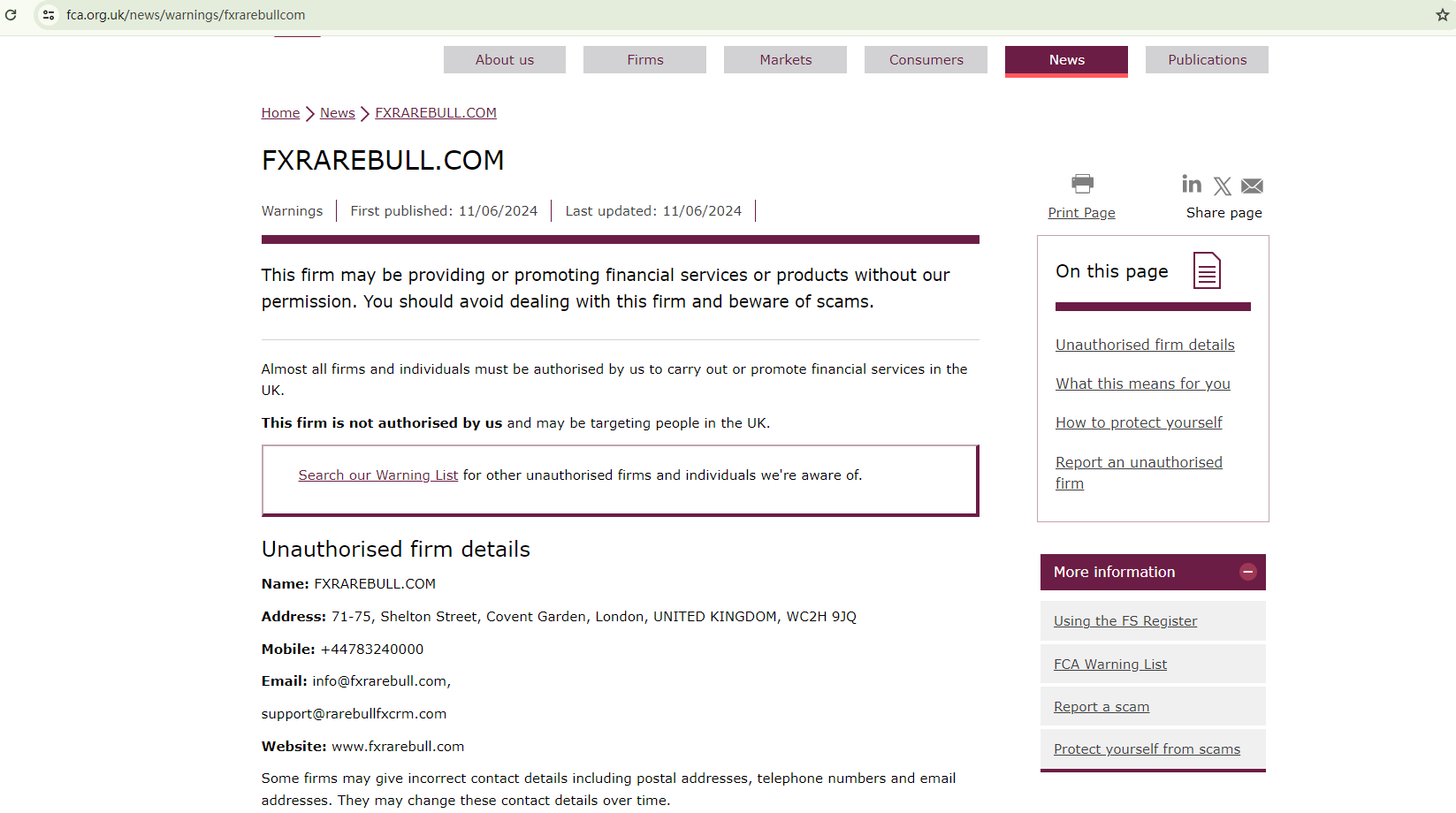 On June 11, 2024, the Financial Conduct Authority (FCA) issued a warning against Rarebull, identifying it as an unauthorized firm in the UK. https://www.fca.org.uk/news/warnings/fxrarebullcom