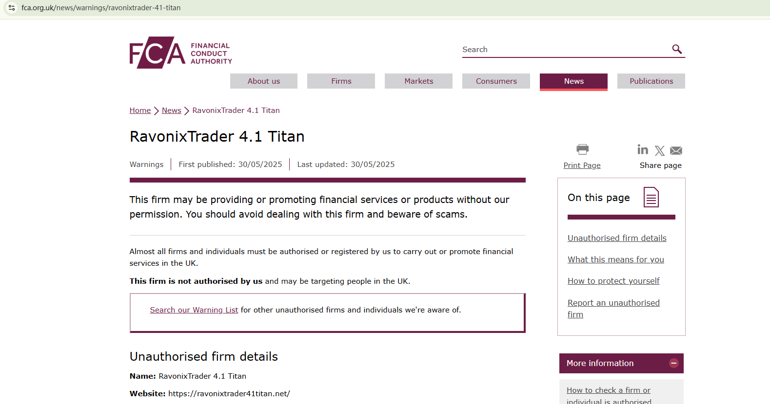 The domain name of RavonixTrader 4.1 Titan was registered in April 2025, making it a relatively new platform. Its recent establishment means there are limited track records available for verification. Upon reviewing the website, we found no valid registration or licensing information to confirm its legitimacy or regulatory compliance. Furthermore, the Financial Conduct Authority (FCA) has issued a warning against RavonixTrader 4.1 Titan for operating without the required authorization.