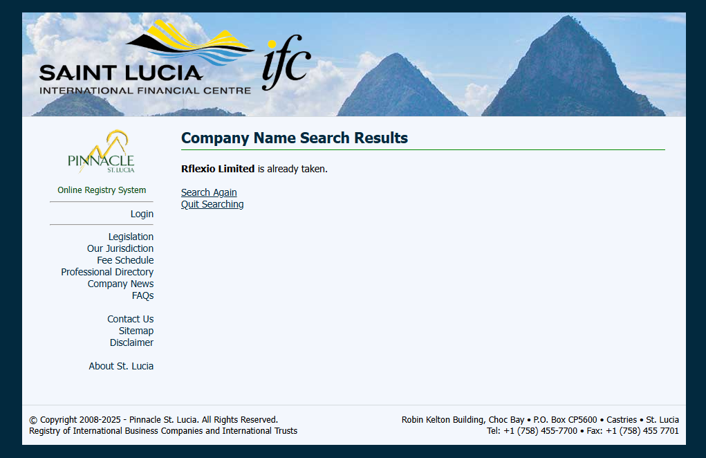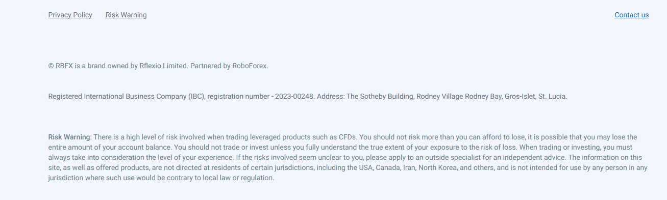 RBFX claims to be a brand of Rflexio Limited, registered in Saint Lucia as an International Business Company (IBC). While we did locate this entity in the Saint Lucia International Financial Centre (IFC) registry, it is crucial to understand that this registration only confers IBC status and does not constitute a valid financial services licence. The IFC does not regulate or license forex trading activities.