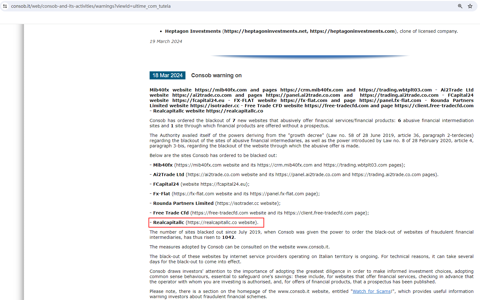 In addition, the Commissione Nazionale per le Società e la Borsa (CONSOB) added Realcapitallc to its warning list as a fraudulent trading platform.