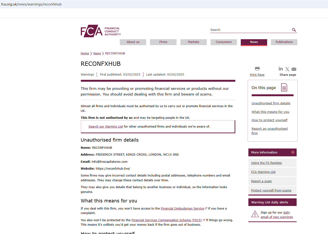 On February 3rd, 2025, the Financial Conduct Authority (FCA) issued a warning against RECONFXHUB, believing this company might be providing financial services or products without proper authorization in the UK. https://www.fca.org.uk/news/warnings/reconfxhub