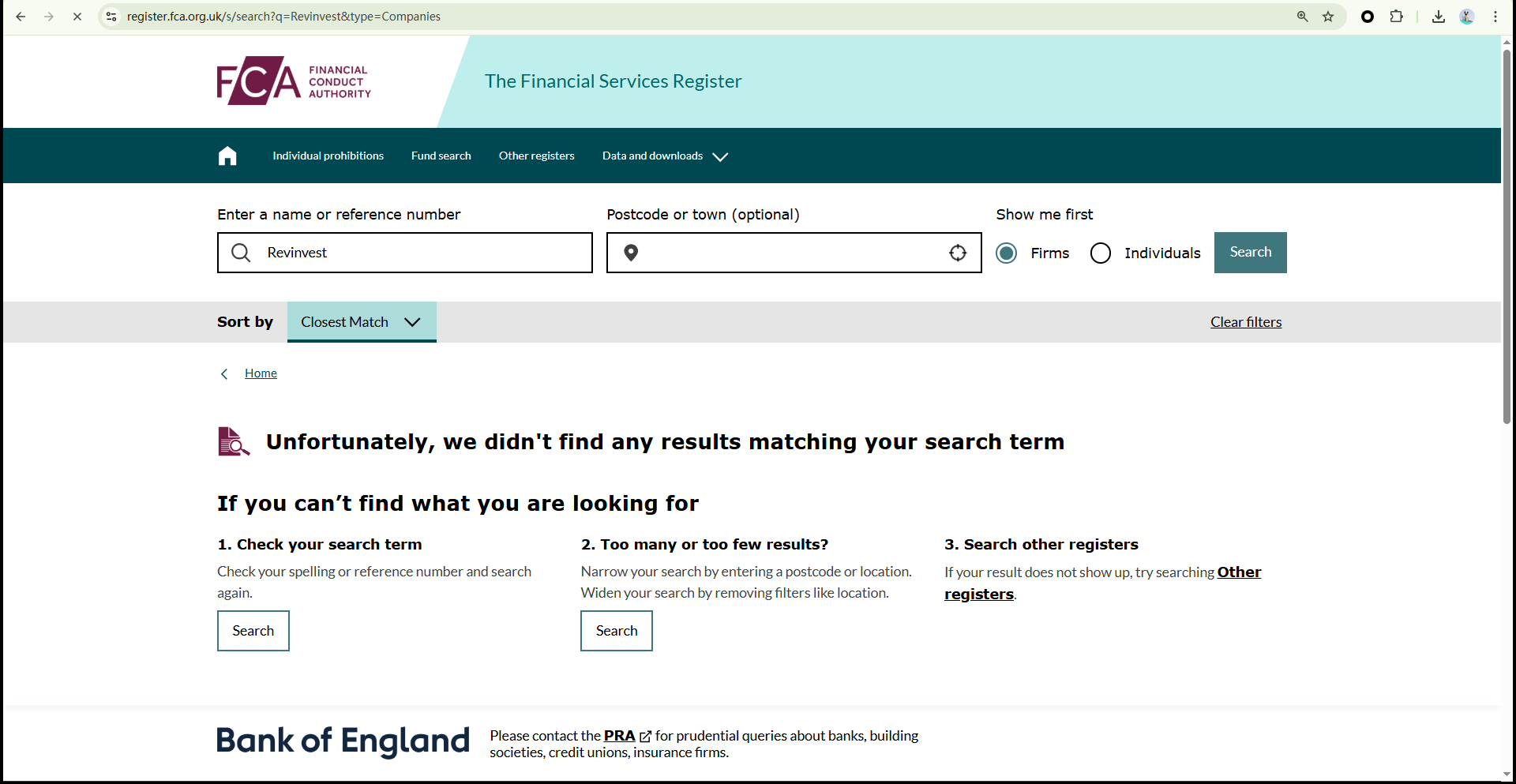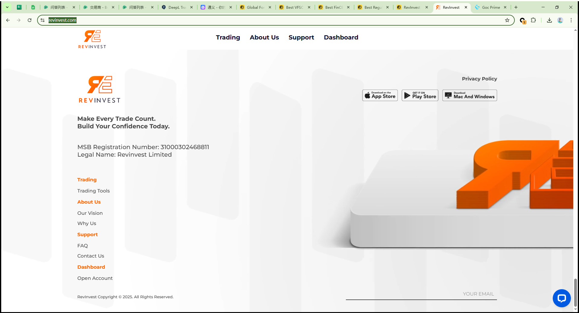 RevInvest claims to be regulated by the UK Financial Conduct Authority (FCA) and by the US Money Service Business (MSB) guidelines set by FinCEN. However, our checks reveal that no related entity is listed in the FCA’s official register, meaning it has no authorization to operate in the UK.