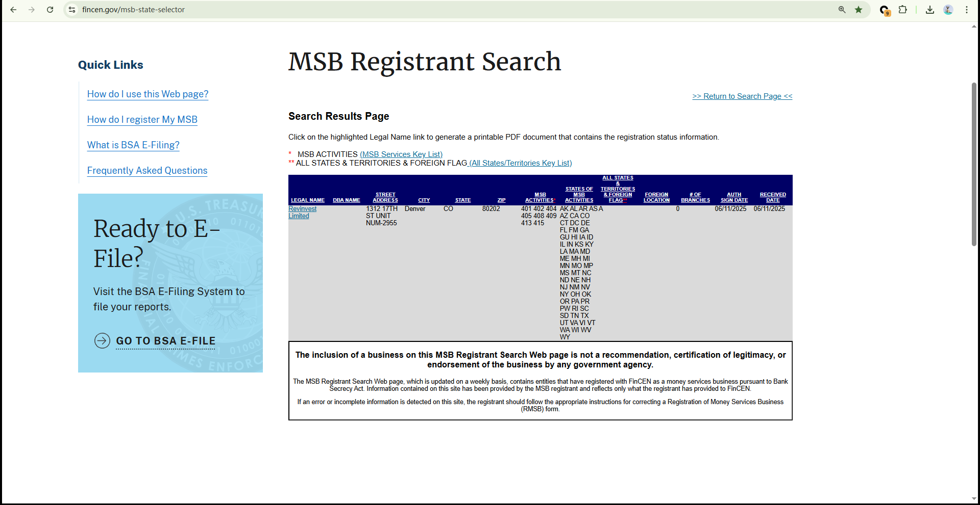 While Revinvest Limited does appear in FinCEN’s registration system, it’s important to note that FinCEN does not regulate forex brokers. This is not a license to offer trading services.