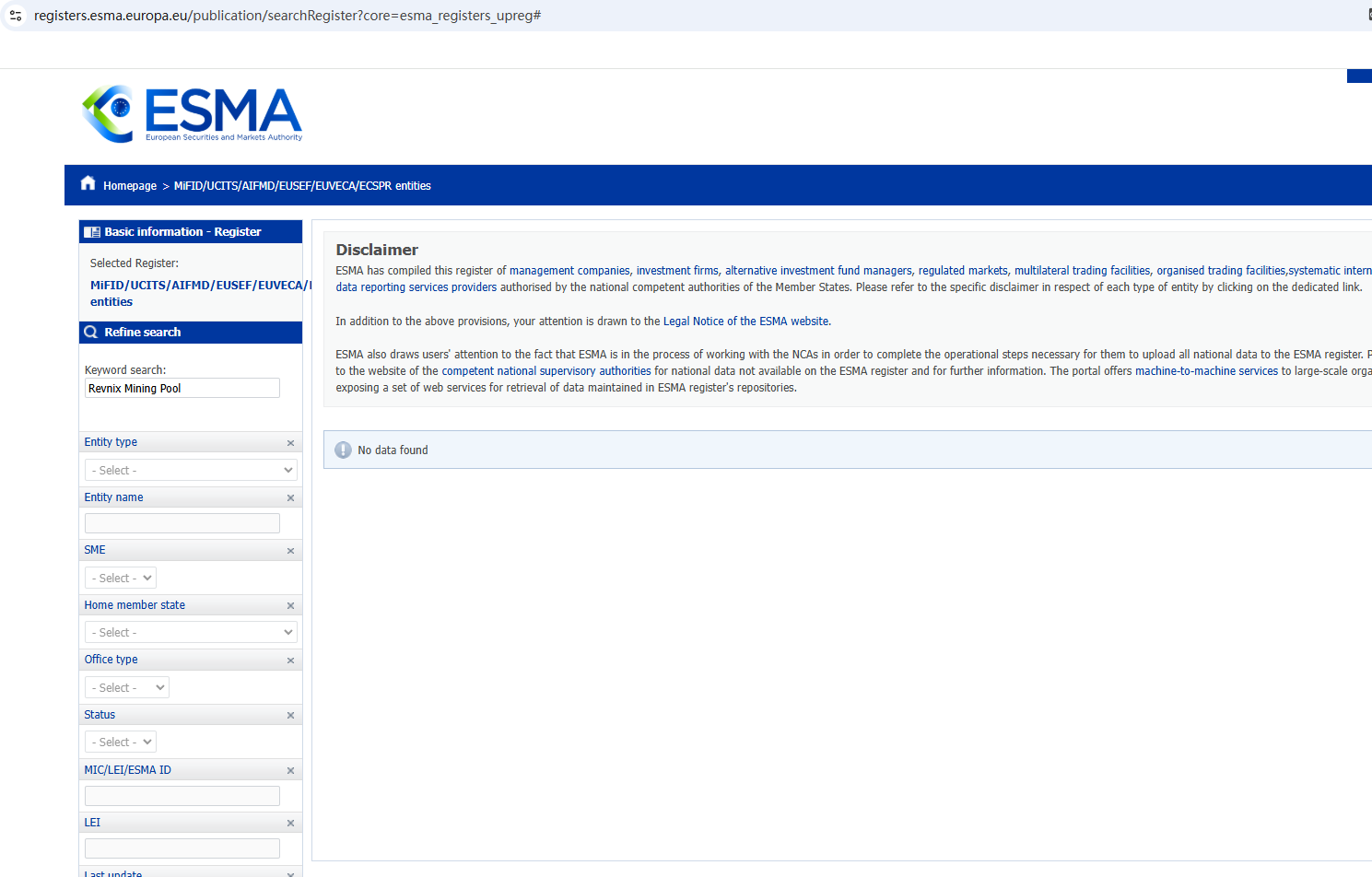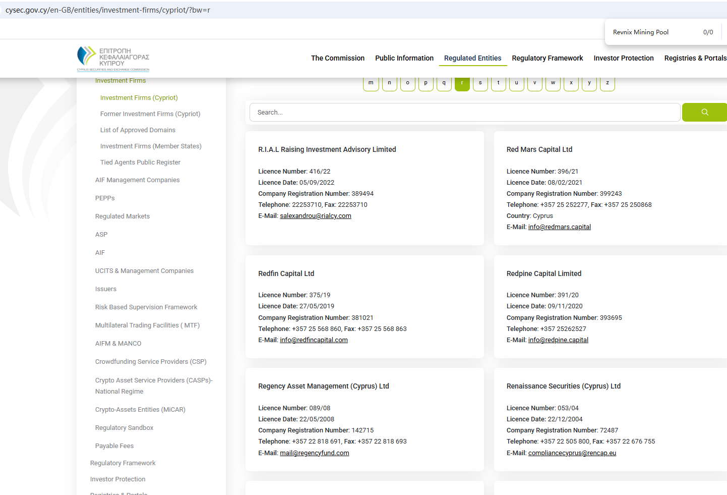 According to its website, it claims to be subject to multiple regulations. Upon investigation, no matching information was found in the Cyprus Securities and Exchange Commission (CySEC), the European Securities and Markets Authority (ESMA), or the British Virgin Islands Financial Services Commission (BVI FSC). We checked the Financial Conduct Authority (FCA) records using the regulatory number they provided and found that Revnix Mining Pool's URL did not match the registered URL. Revnix Mining Pool stole information from a compliant company in an attempt to impersonate its own. In addition, the Australian Securities & Investments Commission (ASIC) issued a warning against Revnix Mining Pool, believing this company might be providing financial services or products without proper authorization.