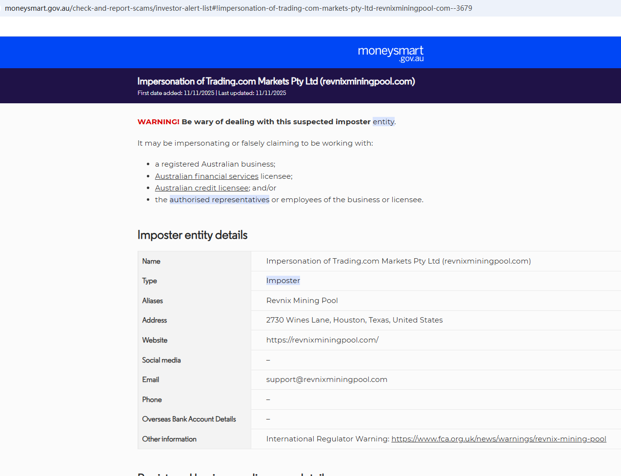 On Nov 11, 2025, the Australian Securities & Investments Commission (ASIC) issued a warning against Revnix Mining Pool, believing this company might be providing financial services or products without proper authorization. https://moneysmart.gov.au/check-and-report-scams/investor-alert-list#!impersonation-of-trading-com-markets-pty-ltd-revnixminingpool-com--3679