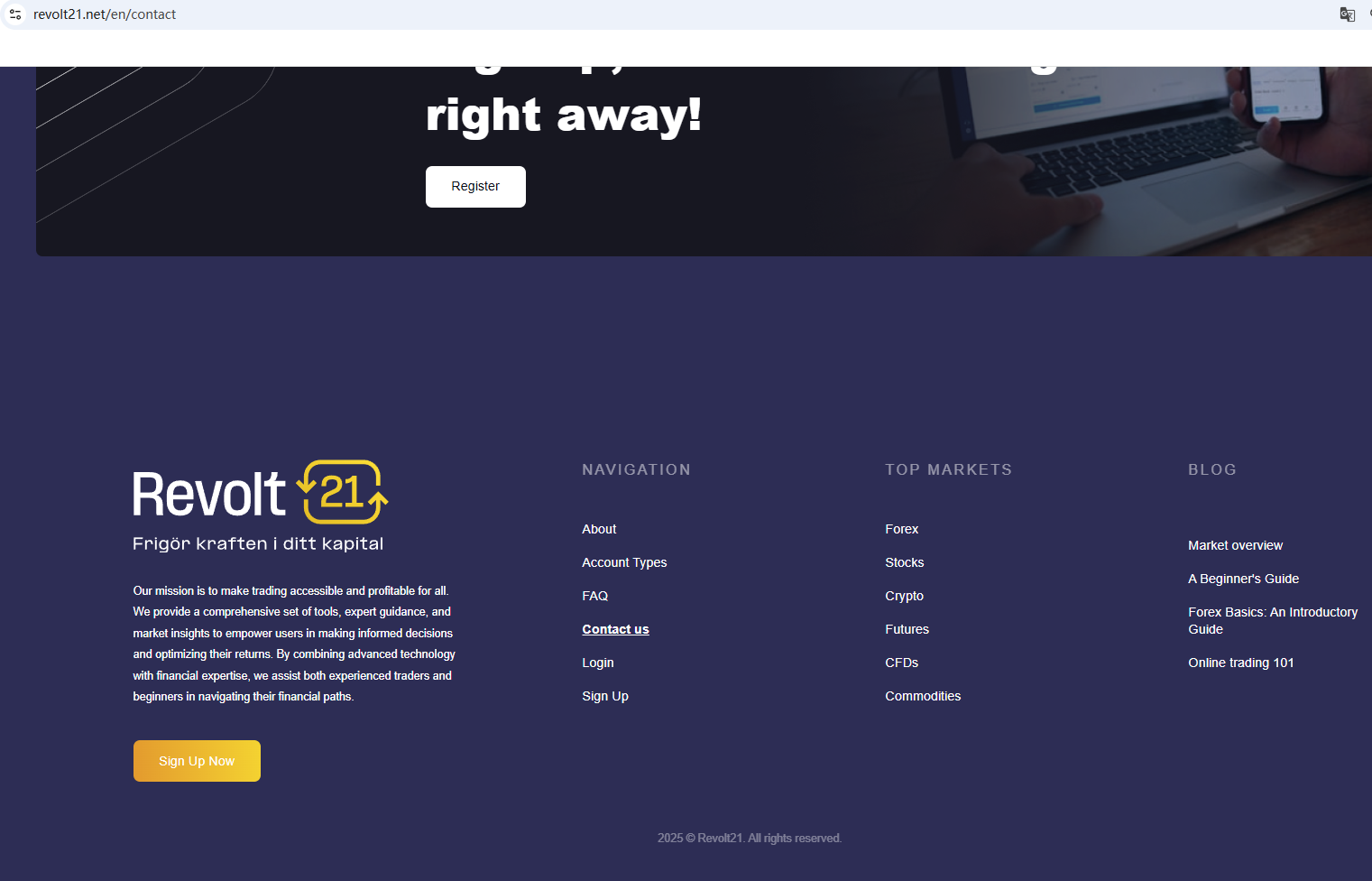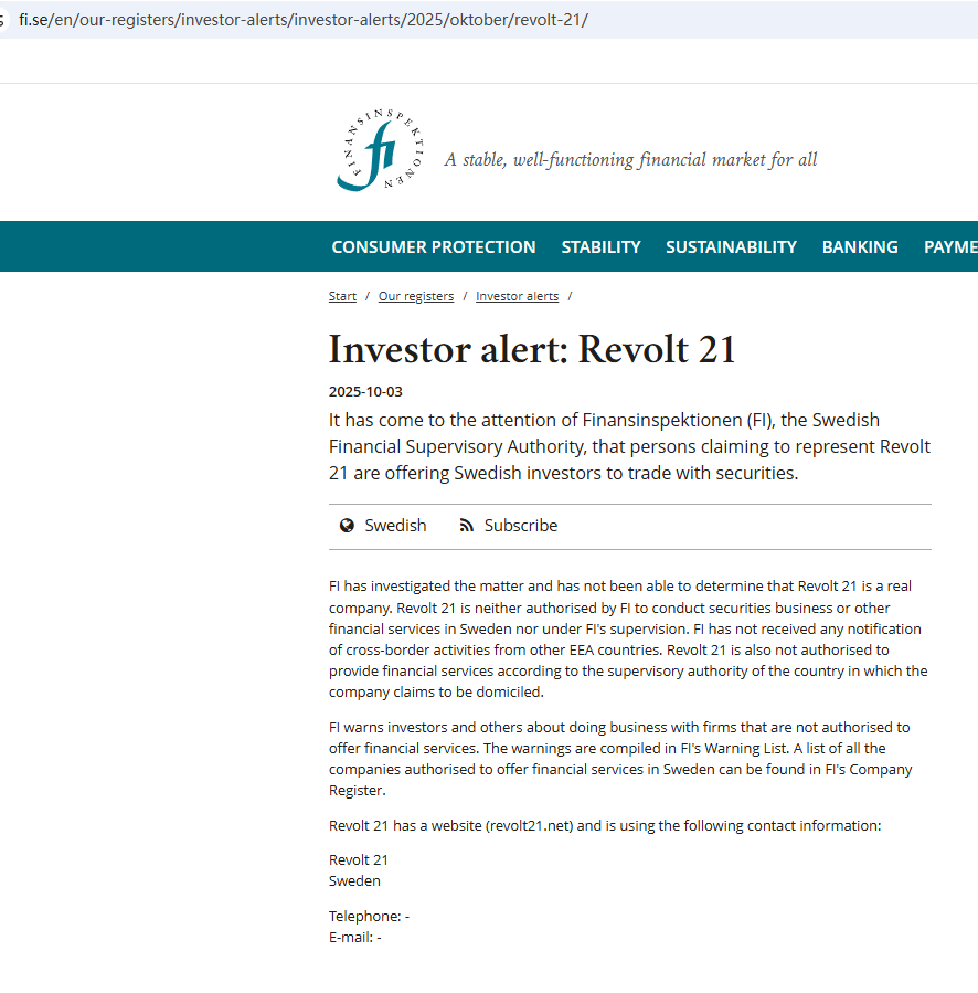 According to its website, it claims to be a reliable company founded in 2016. However, our investigation revealed that its domain was only established in 2025, clearly indicating that the information displayed on its website is inconsistent with the facts. Furthermore, it does not provide any valid regulatory information for verification on its website. More notably, the Finansinspektionen (FI) issued a warning against Revolt 21, suspecting that it is not a real company.