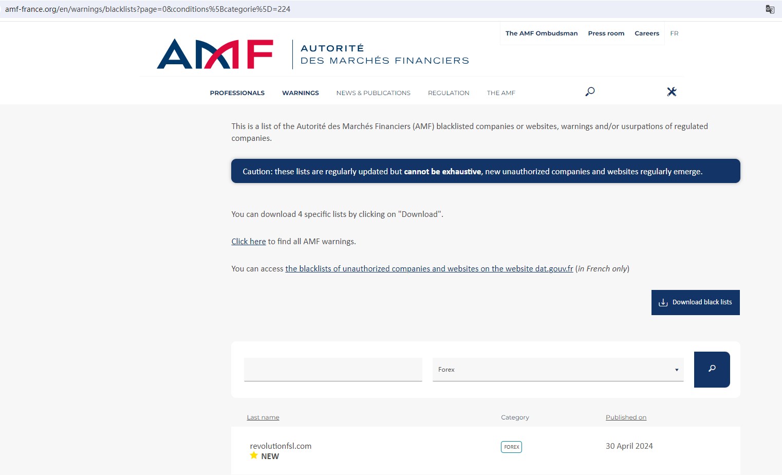 And The Financial Authority (Autorité des Marchés Financiers, AMF) issued a warning that Revolution FSL (revolutionfsl.com) was providing financial services or products without authorisation.