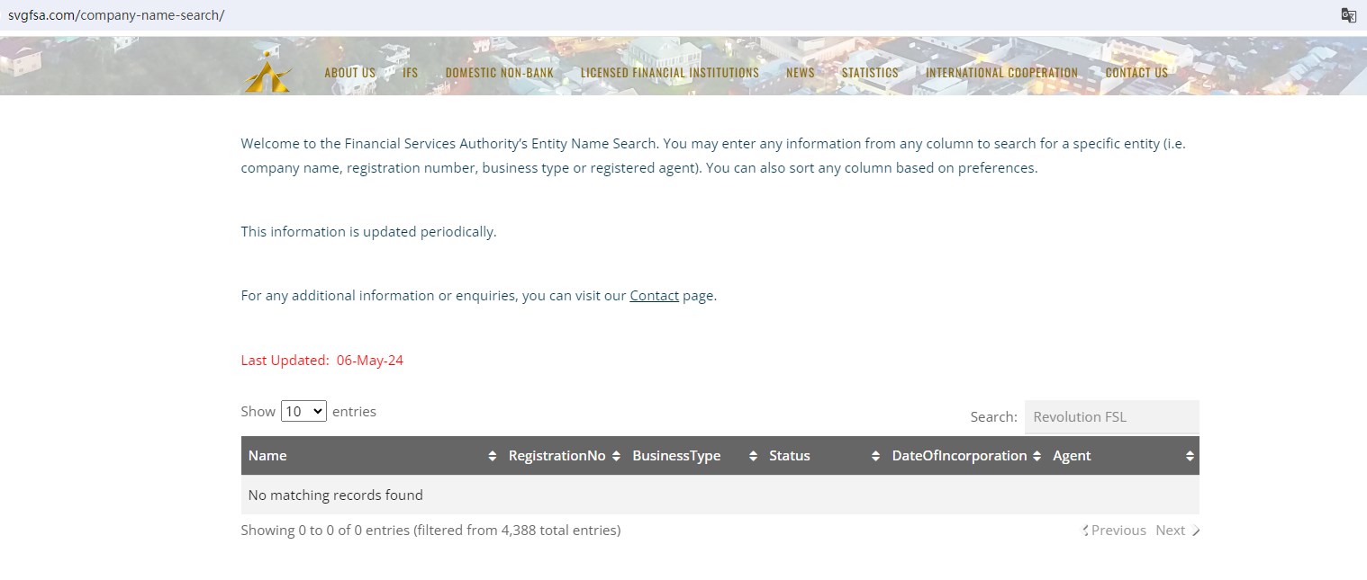 Upon investigation, we found that Revolution FSL Limited is not registered by SVG FSA, an offshore authority that doesn't license forex trading brokerage activities.