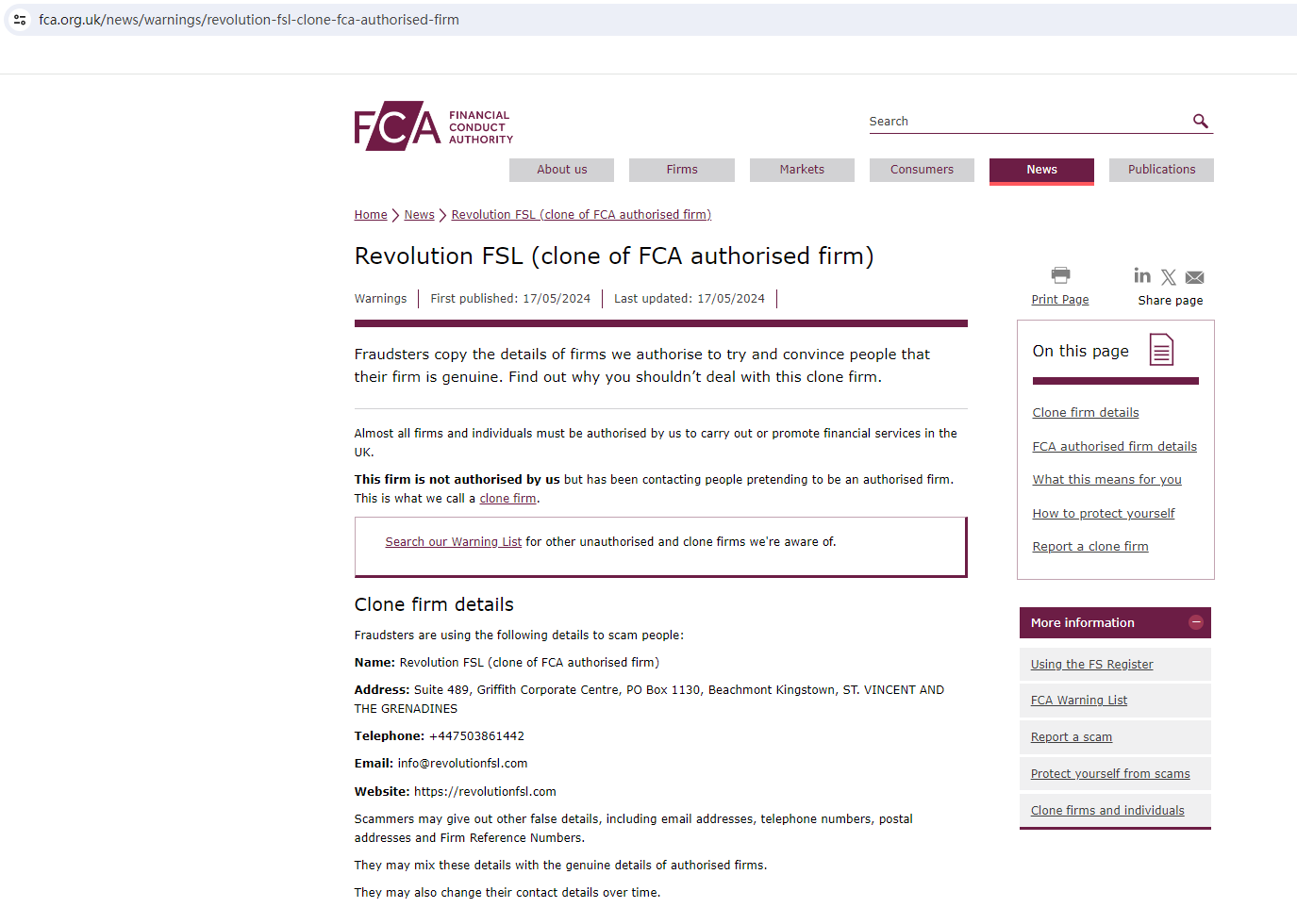 On May 17, 2024, the Financial Conduct Authority (FCA) issued a warning against Revolution FSL, identifying this company as a clone of an FCA-authorized firm. https://www.fca.org.uk/news/warnings/revolution-fsl-clone-fca-authorised-firm