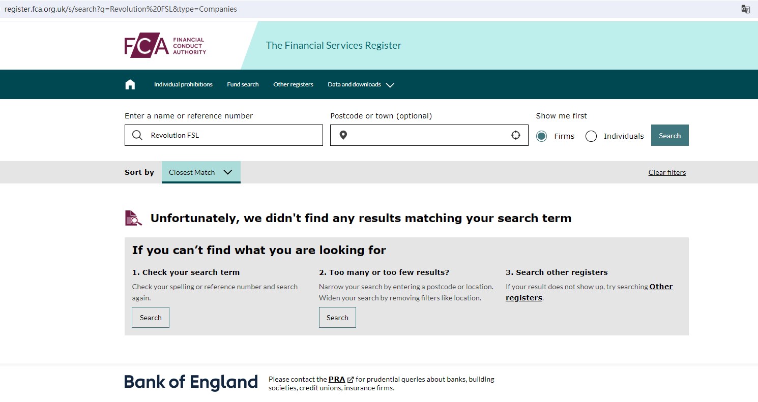 Revolution FSL is also not authorized by the United Kingdom Financial Conduct Authority (FCA).