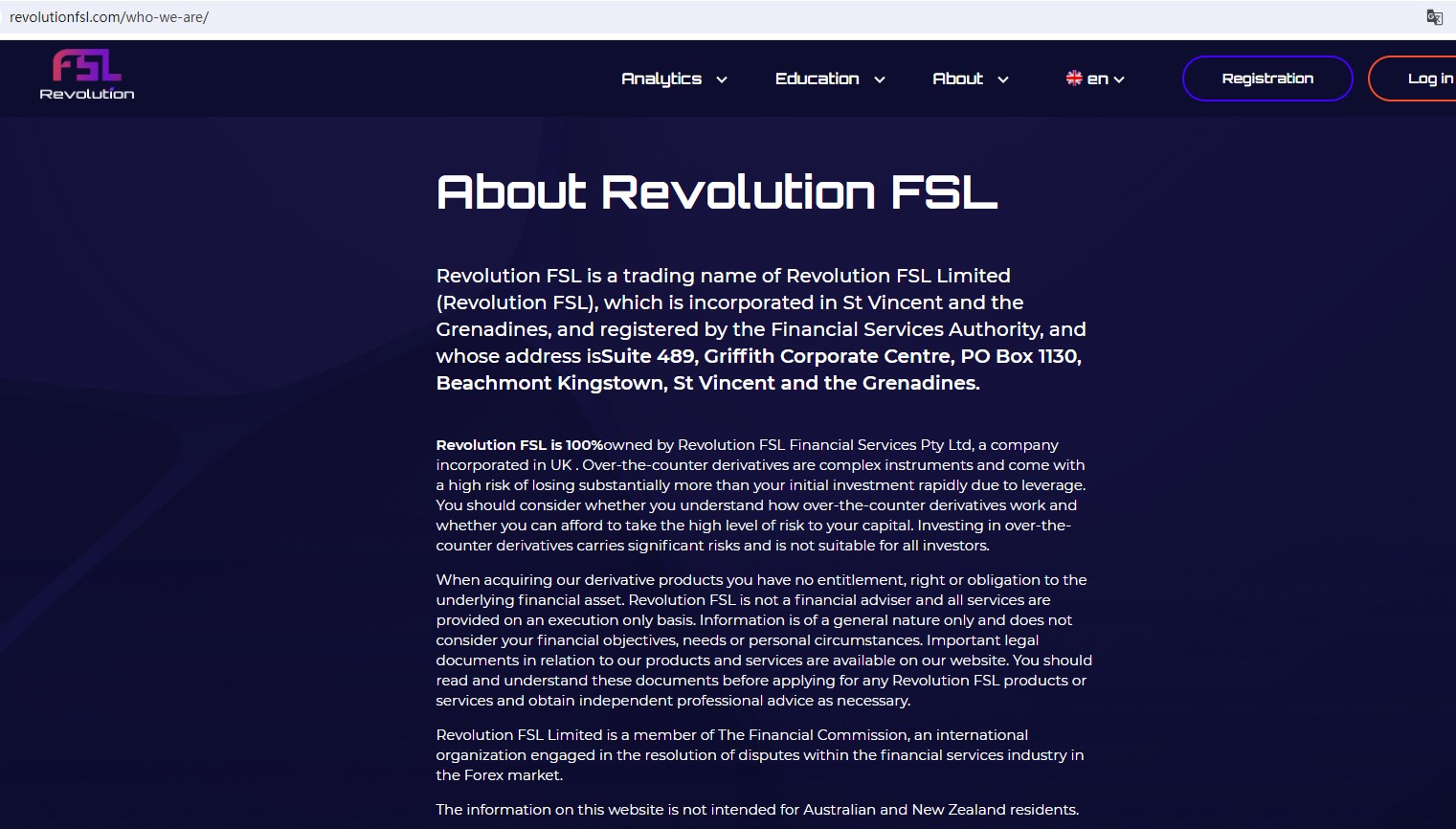 Revolution FSL claims to be a trading name of Revolution FSL Limited (Revolution FSL), which is incorporated in St Vincent and the Grenadines, and registered by the Financial Services Authority (FSA), Revolution FSL also is owned by Revolution FSL Financial Services Pty Ltd, a company incorporated in UK, offering wide range of financial services, including Forex, Commodities, Indices, Stocks and more instruments in global markets.