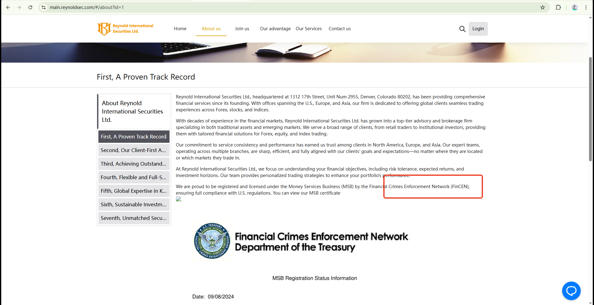 Reynold International Securities claims to be headquartered in the United States, with offices spanning the US, Europe and Asia. However, the only licence it claims to hold is an MSB licence issued by the Financial Crimes Enforcement Network (FinCEN). Please note that FinCEN does not regulate CFD trading.