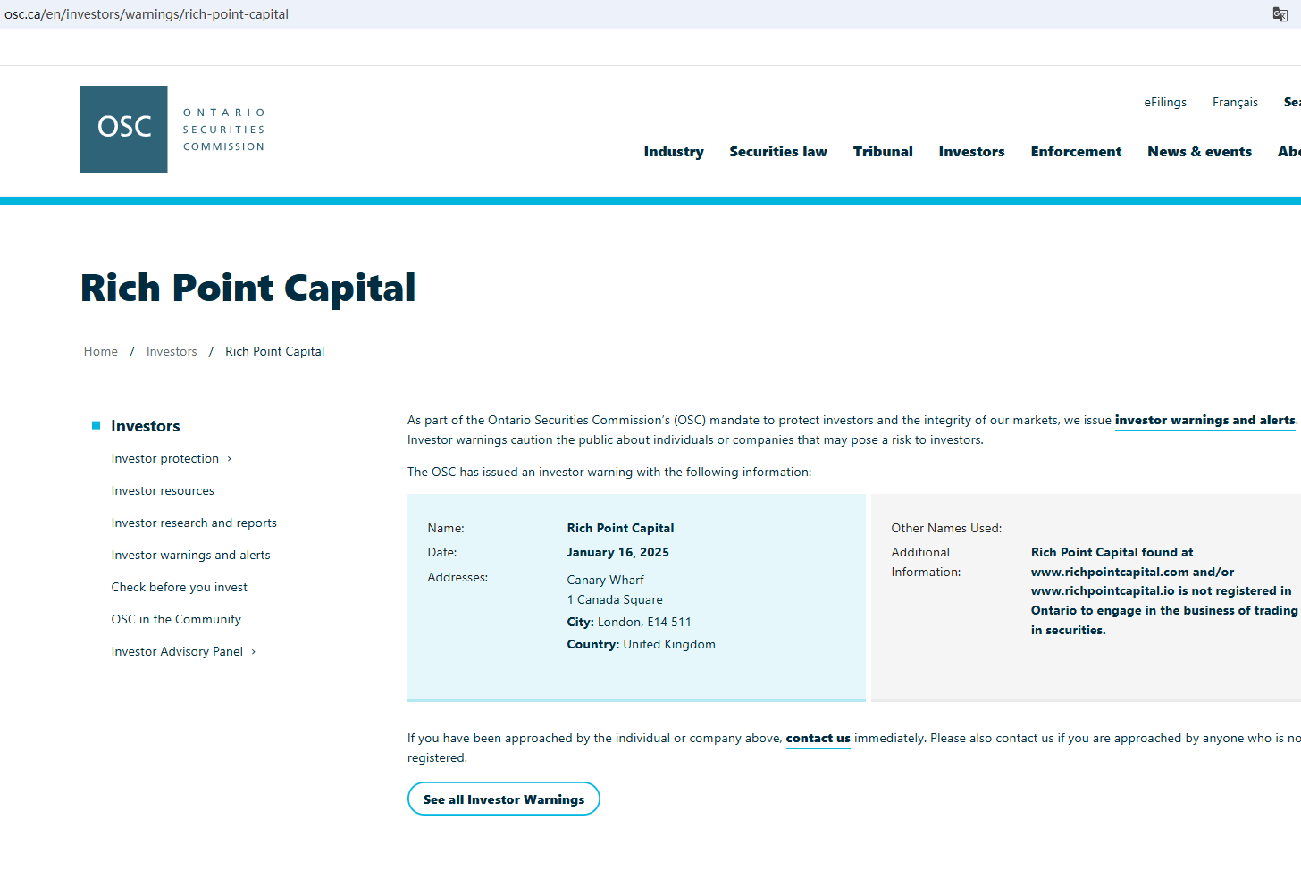 Moreover, the Ontario Securities Commission (OSC) issued a warning against Rich Point Capital, believing this company might be providing financial services or products without proper authorization.