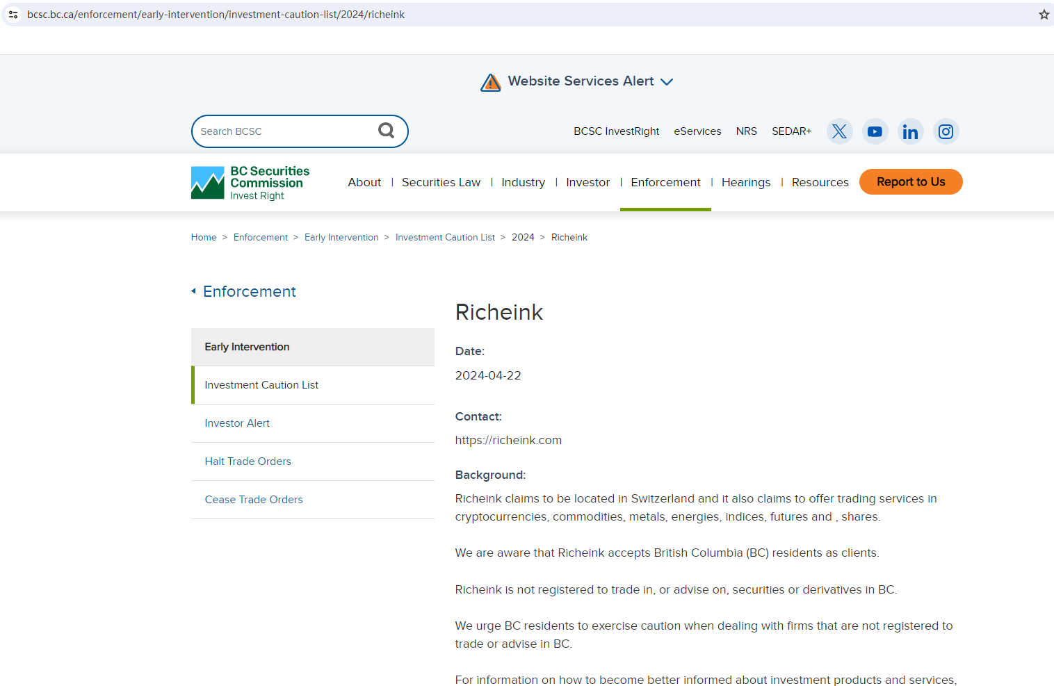 In addition, the British Columbia Securities Commission (BCSC) issued a warning that Richeink was providing financial services or products without authorization.