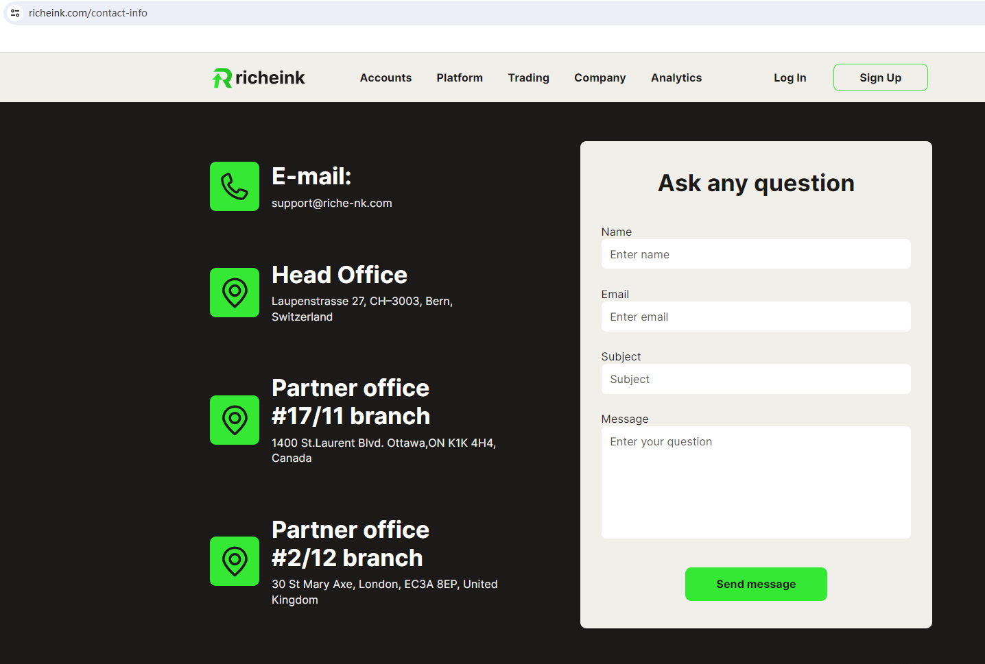 According to its website, it displays three addresses on the page. Headquartered in Switzerland, with one branch in Canada and another in the UK. However, upon investigation, no matching information was found in the Swiss Financial Market Supervisory Authority (FINMA), Investment Industry Regulatory Organization of Canada (IIROC), and Financial Conduct Authority (FCA).