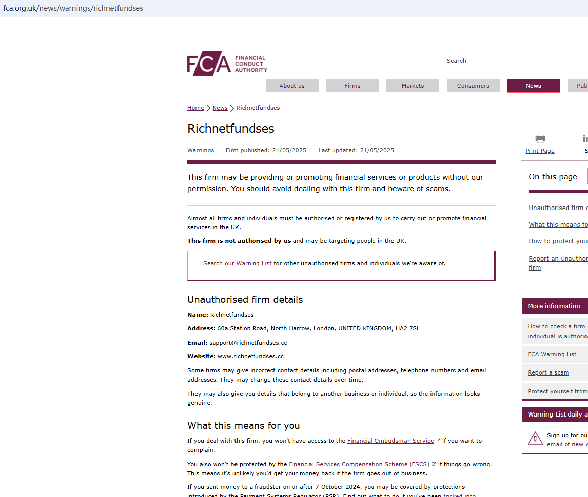 On May 21, 2025, the Financial Conduct Authority (FCA) issued a warning against Richnetfundses, believing this company might be providing financial services or products without proper authorization in the UK. https://www.fca.org.uk/news/warnings/richnetfundses