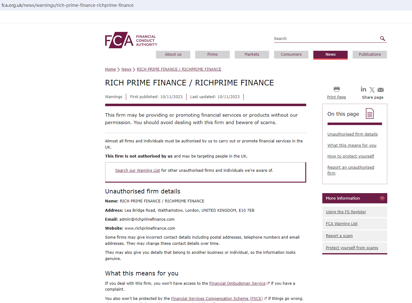 On 10 October 2023, the United Kingdom Financial Conduct Authority (UK FCA) issued a warning that Richprime Finance was providing financial services or products in the UK without authorisation. You may visit: https://www.fca.org.uk/news/warnings/rich-prime-finance-richprime-finance
