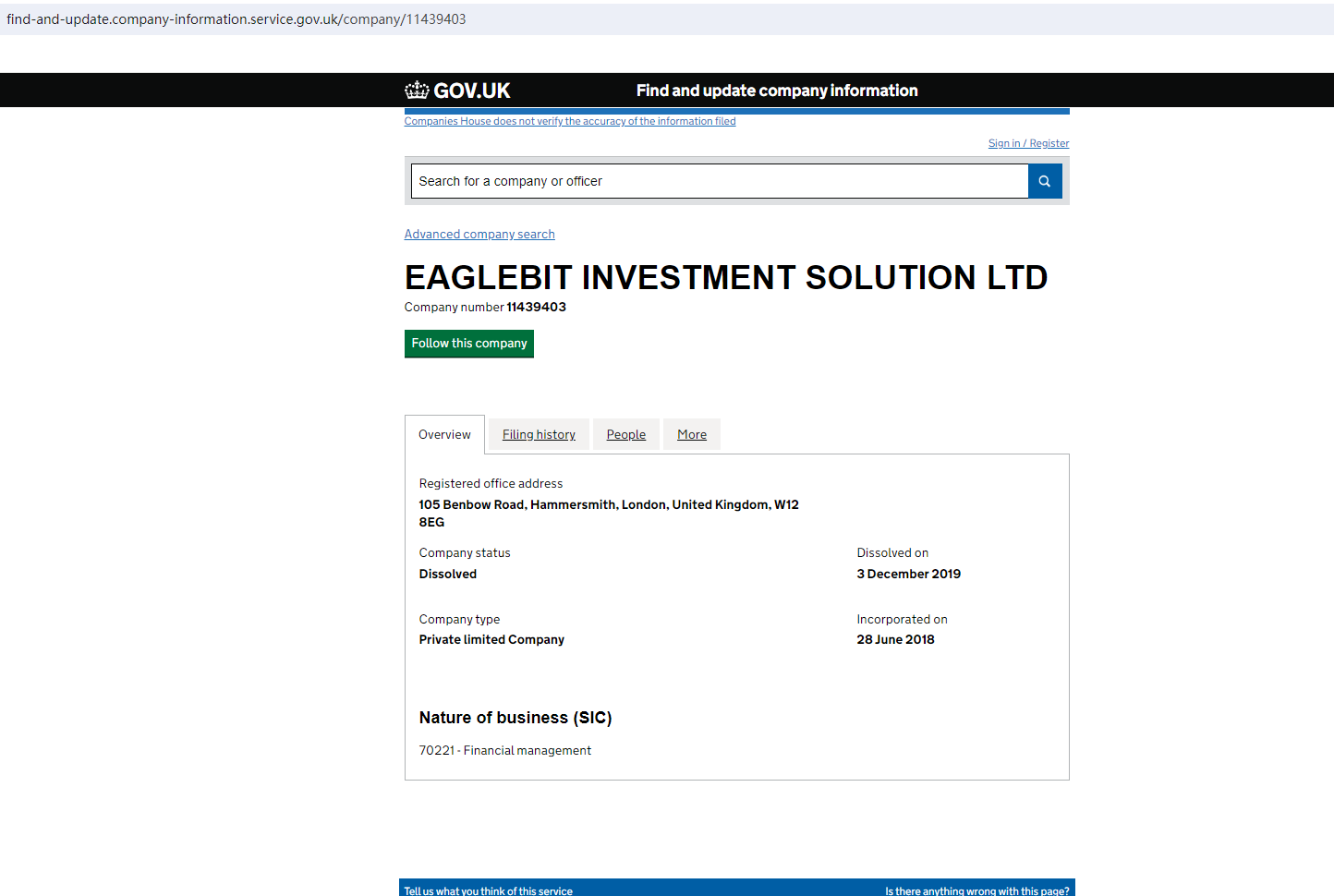 The platform claims to provide cryptocurrency trading services and is registered in the United Kingdom with registration number 11439403. The company name we found on the Company House (CH) page is EAGLEBIT INVESTMENT SOLUTION LTD, which does not match the platform information and was dissolved on December 3, 2019. Obviously, the platform provided false registration information. In addition, it is located in the UK, and after checking the Financial Conduct Authority (FCA), it was found that the FCA had not authorized it.