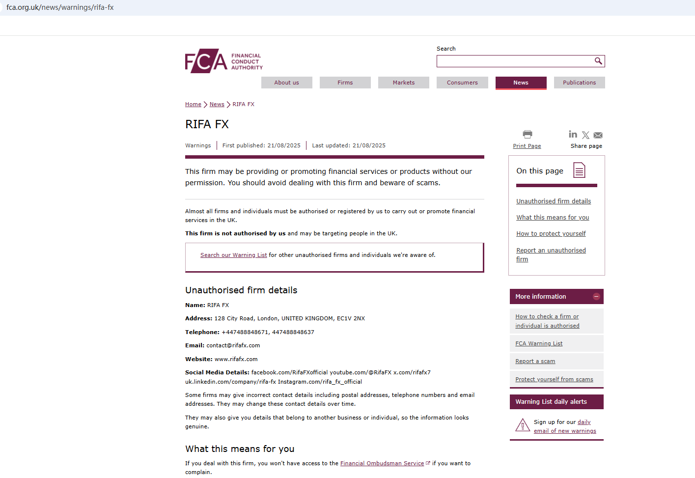 On Aug 21, 2025, the Financial Conduct Authority (FCA) issued a warning against Rifafx, believing this company might be providing financial services or products without proper authorization. https://www.fca.org.uk/news/warnings/rifa-fx